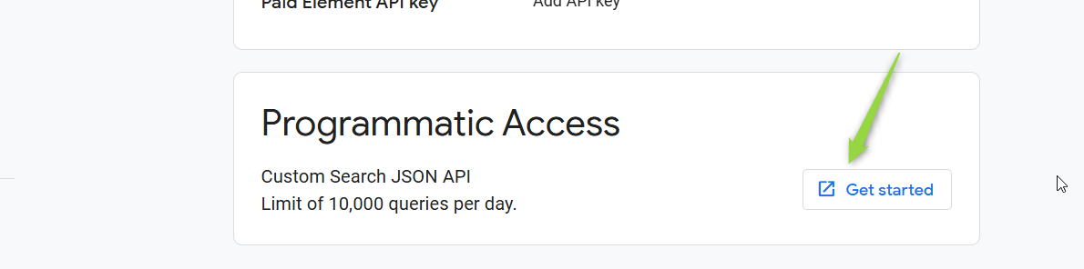 Access Programmatic Access Section: In the Programmable Search Engine control panel, scroll down to the "Programmatic Access" section and click the "Get started" button.