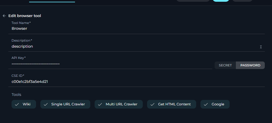- API Key: In the "API Key" field, paste the Google API Key you obtained in the previous steps or select a secure secret ( mandatory only in case Google tool is selected ).