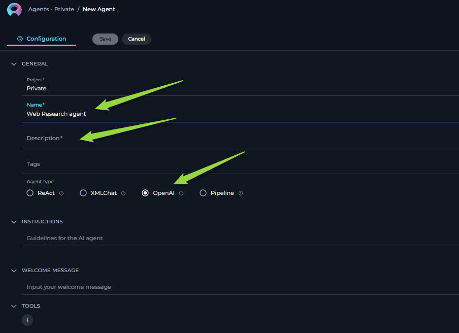 - Create a New Agent: Click on the "+ Agent" button to create a new Agent. Follow the on-screen prompts to define essential Agent attributes such as Agent name, a descriptive Agent description, the desired Agent type, and initial instructions for the Agent.