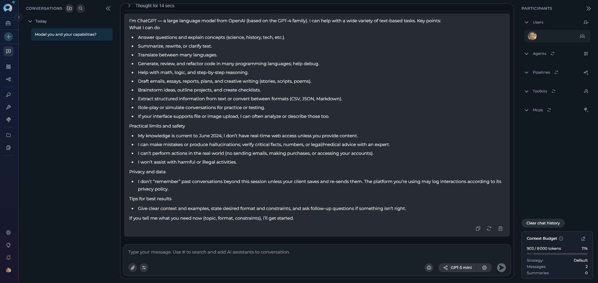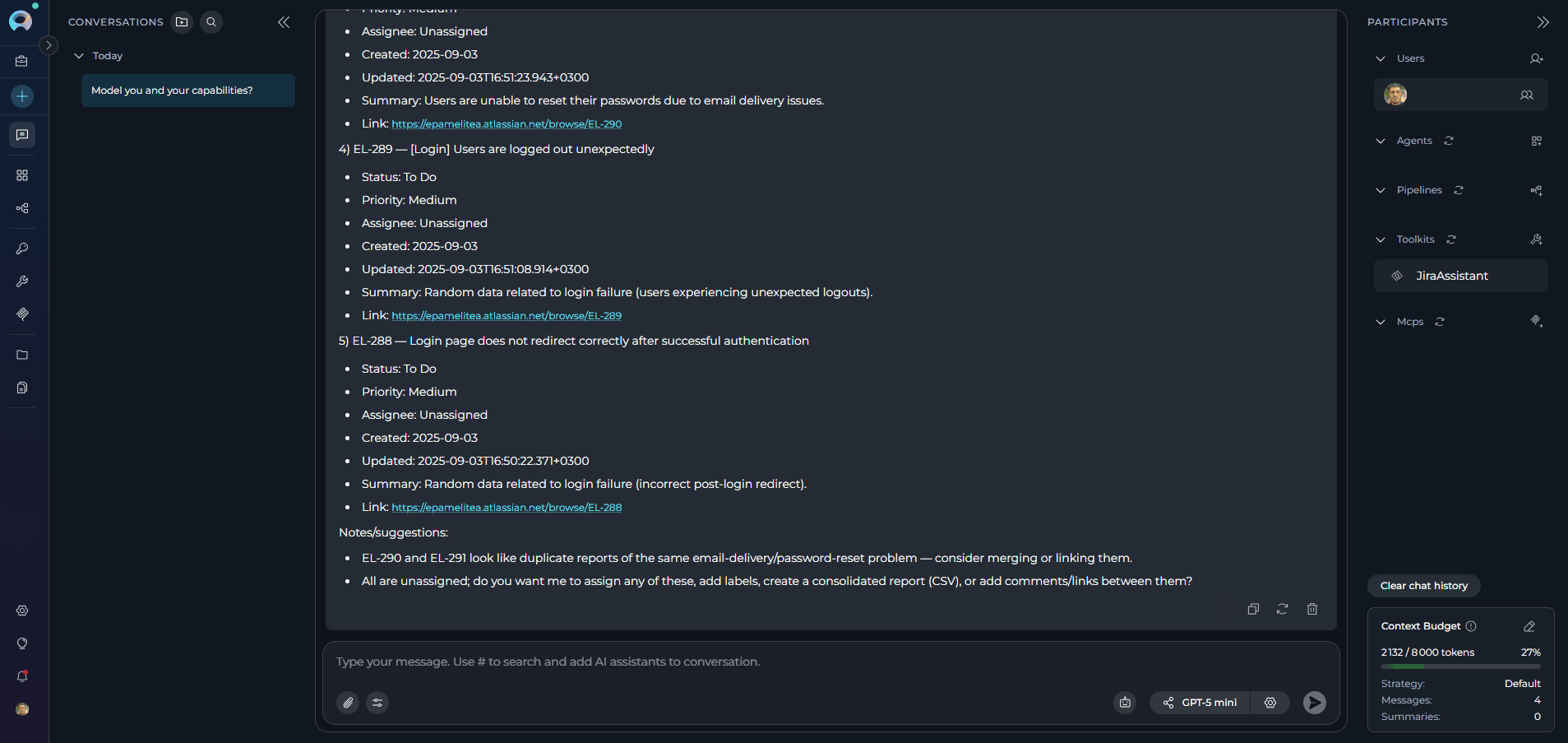 Get started with ELITEA by sending your first chat message. This hands-on guide will walk you through the essentials of using Chat, the heart of the ELITEA platform.