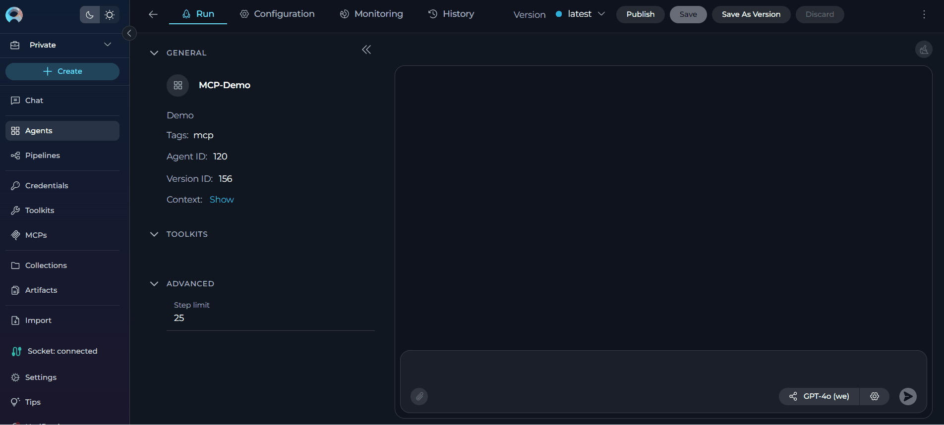 - Your MCP appears in the Elitea MCPs menu with tools listed