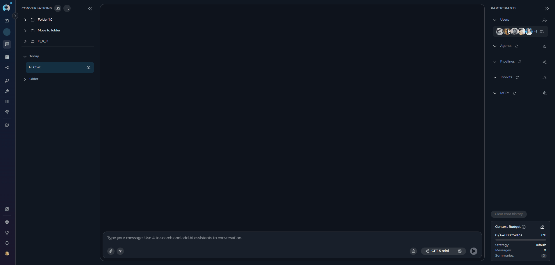 In team projects, you can collaborate with colleagues by adding them as participants to your conversations. This enables real-time communication, @mentions for notifications, and seamless teamwork alongside AI assistants (agents, pipelines, toolkits).
