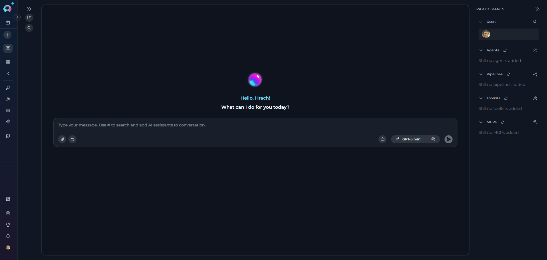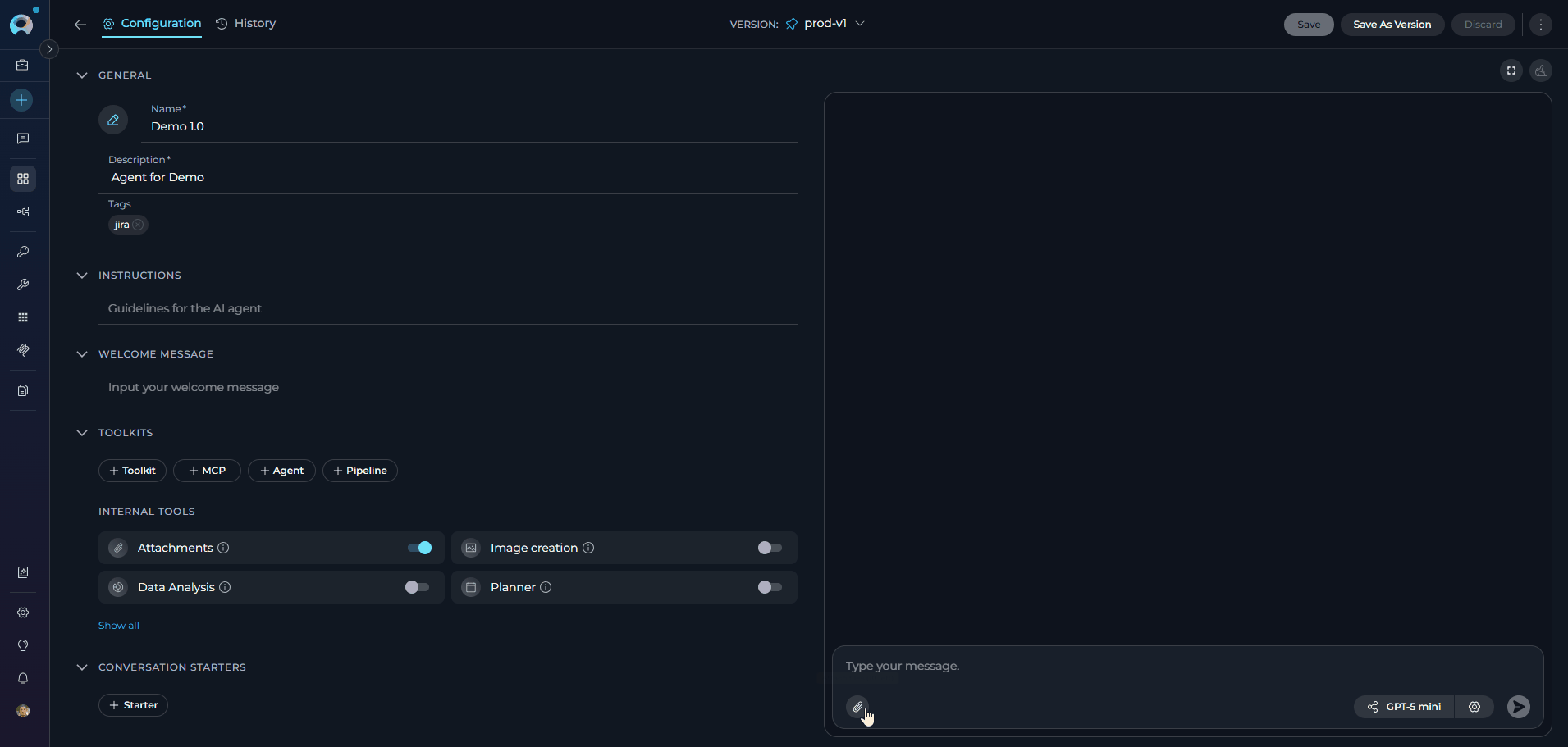 Result: The Attachments internal tool is added to the agent. The backend automatically provisions storage using the default attachments bucket — no additional toolkit configuration is required. The paperclip icon becomes enabled in the message input area when using this agent in a conversation.