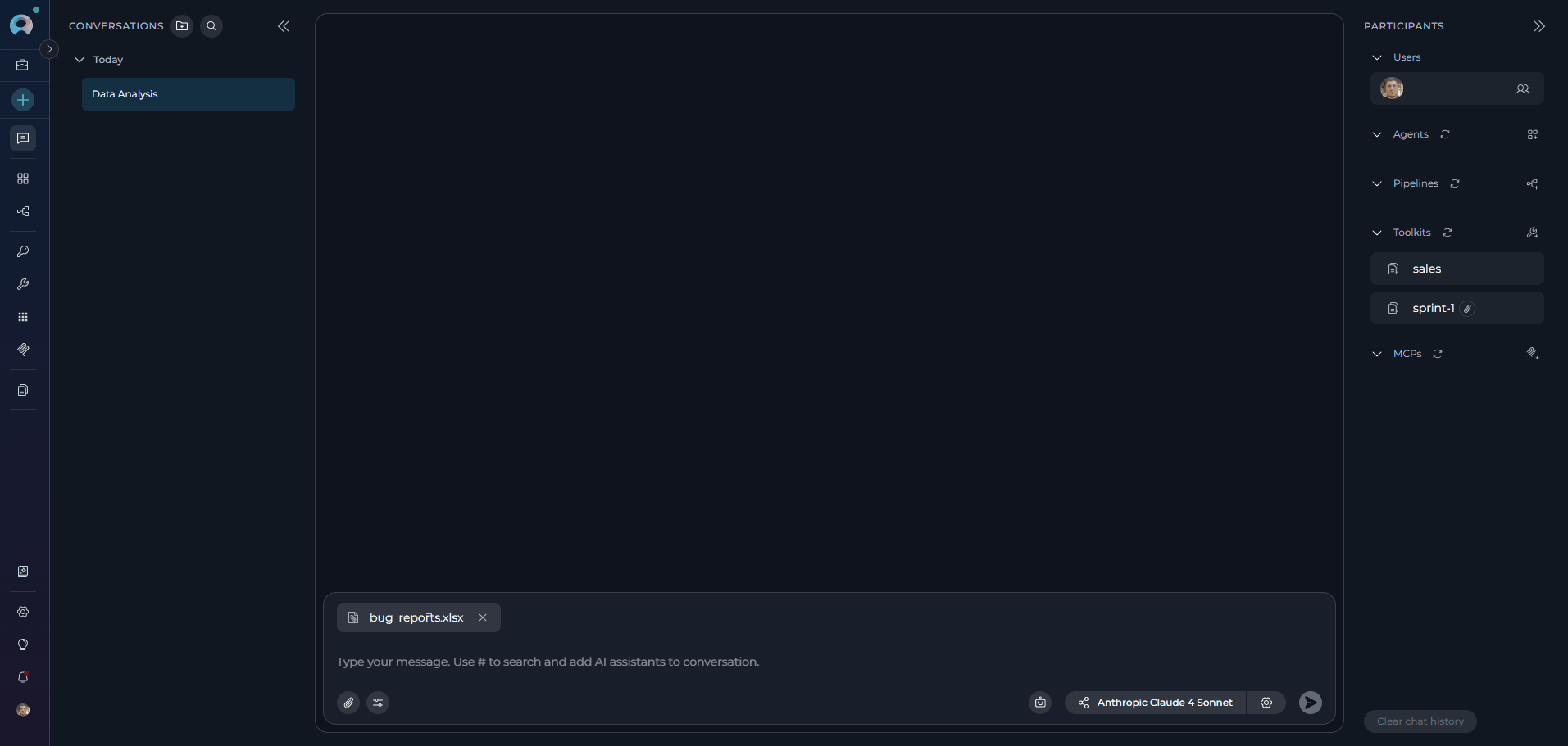 - Upload Data: Upload CSV, Excel, or other data files to your conversation