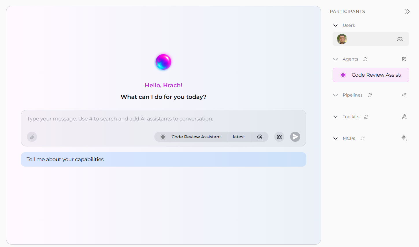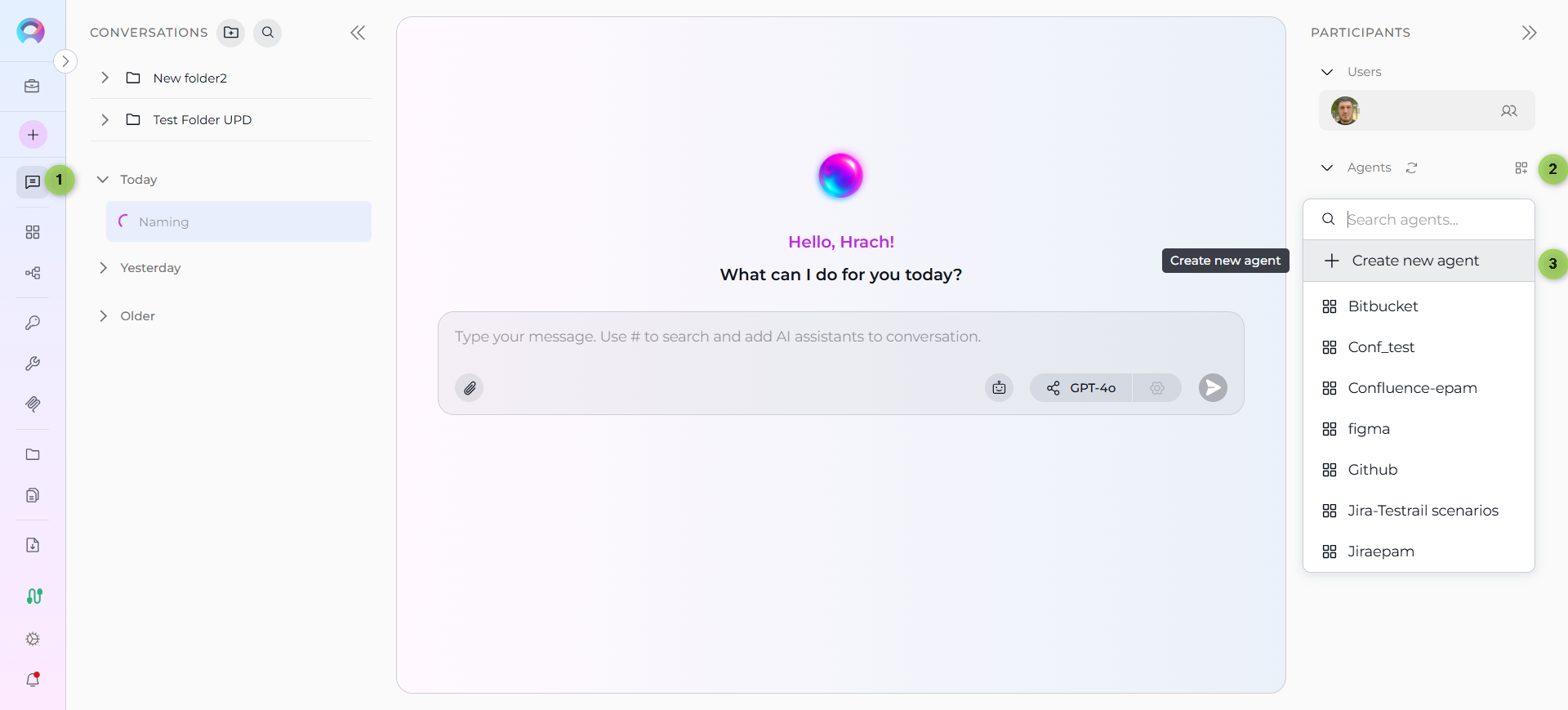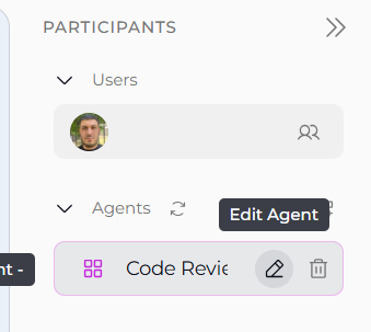 - Instant Integration: Created agents are immediately available for use in conversations and can be added to the PARTICIPANTS section.