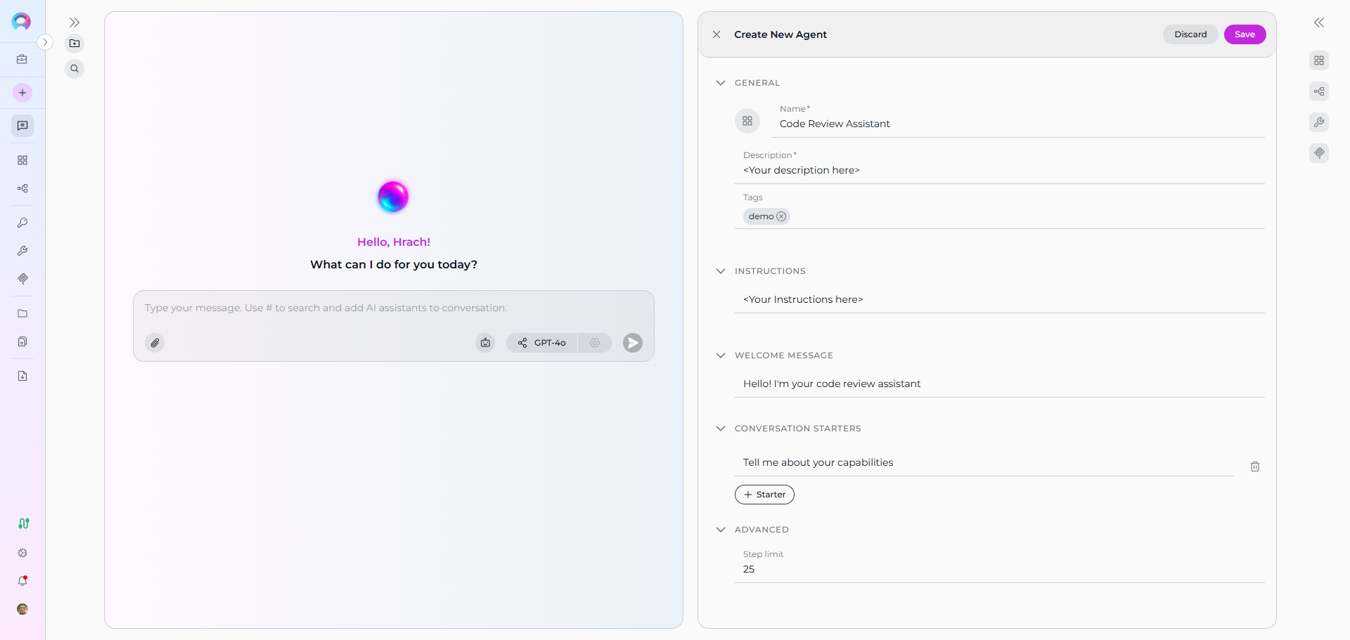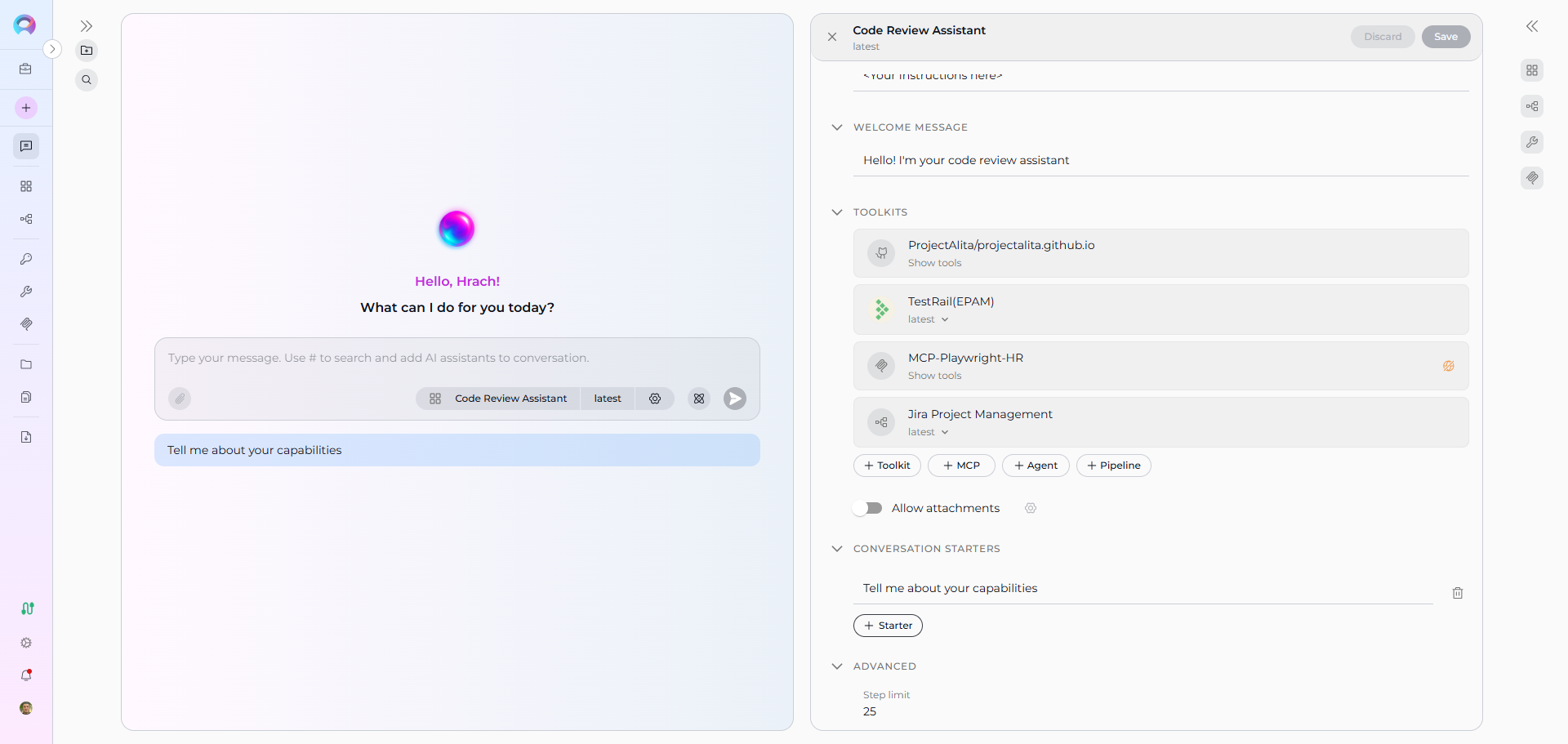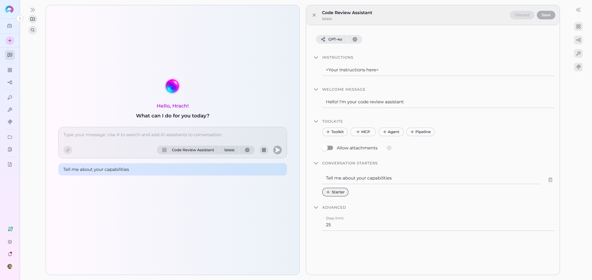 For example, if you have an agent configured for code review, you can easily update the Instructions to include new coding standards, add additional Toolkits like Jira for issue tracking integration, Select another LLM Model and update Model Settings