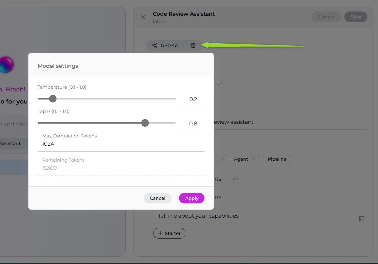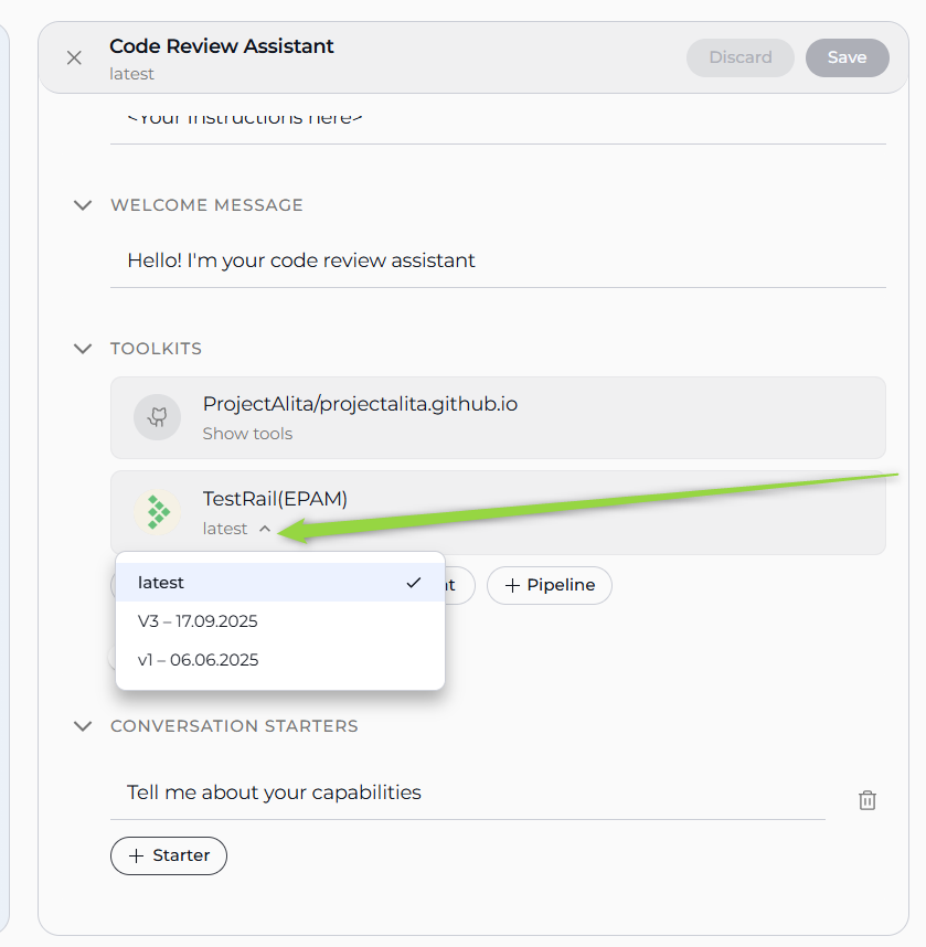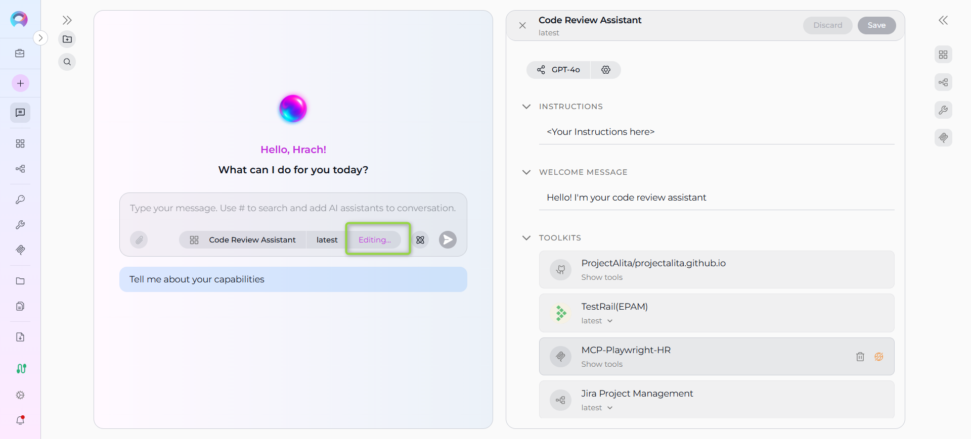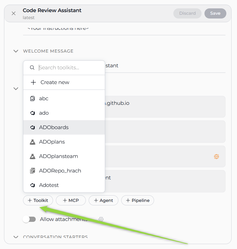 For example, if you have an agent configured for code review, you can easily update the Instructions to include new coding standards, add additional Toolkits like Jira for issue tracking integration, Select another LLM Model and update Model Settings