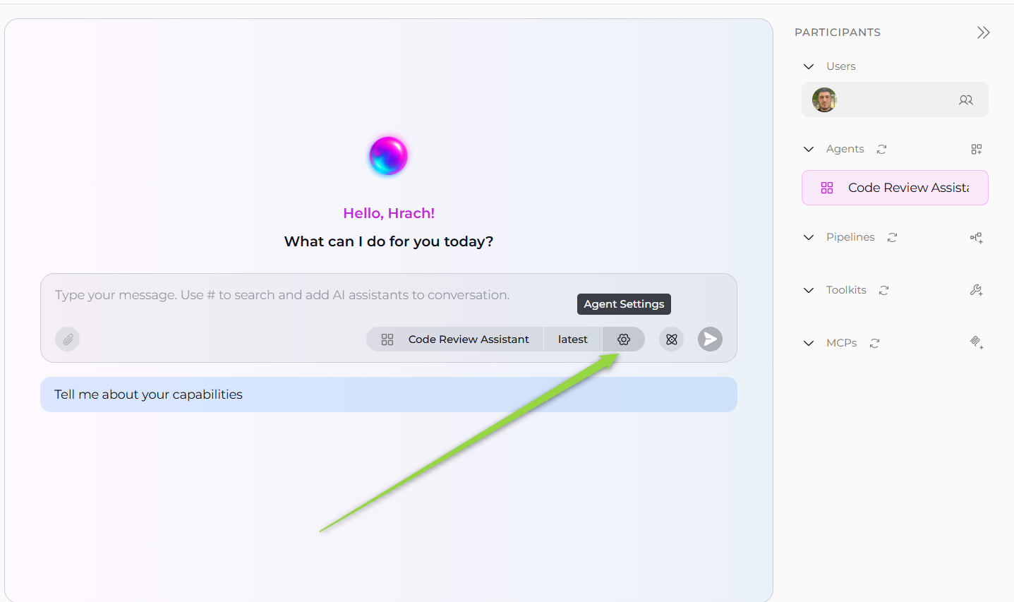 - When an agent is active in your conversation, click the Agent Settings button that appears in the chat interface.