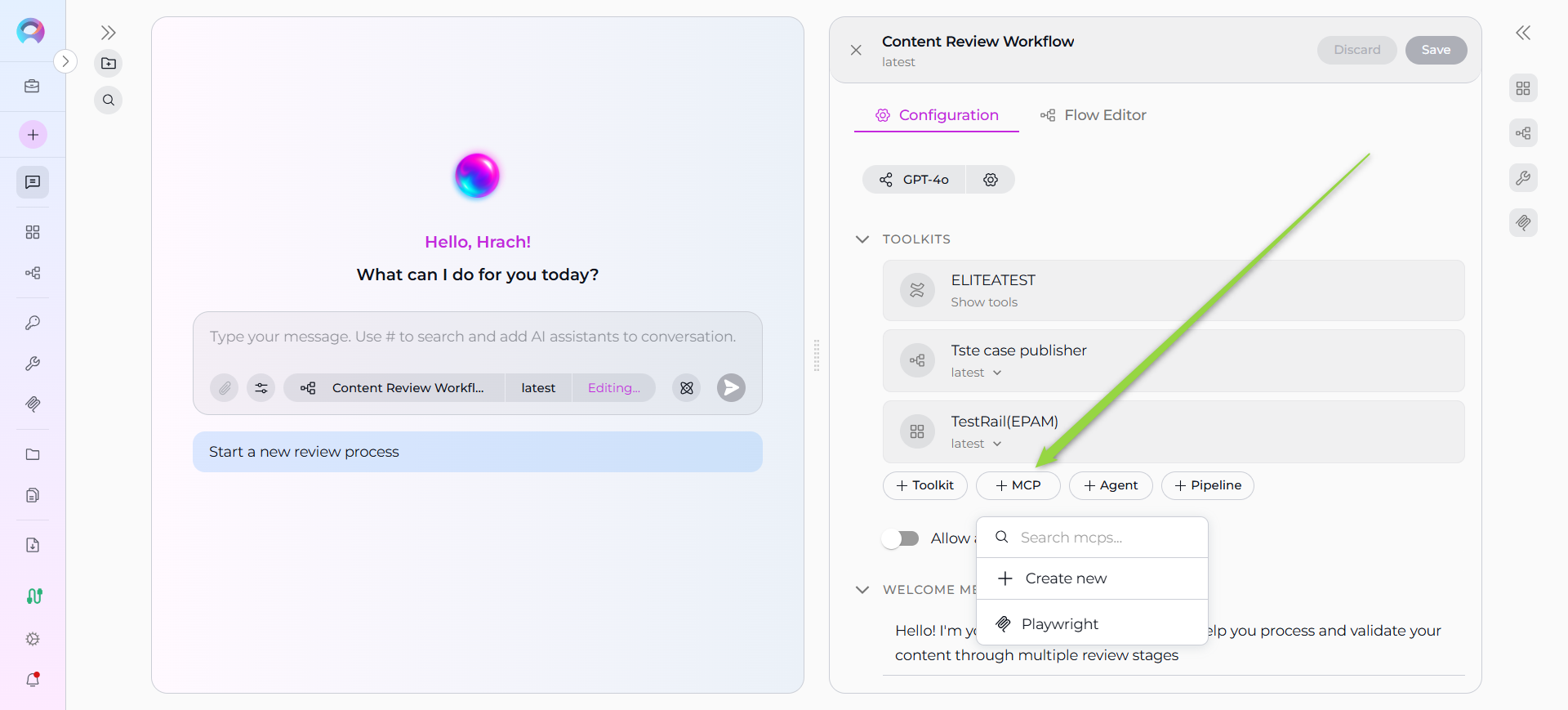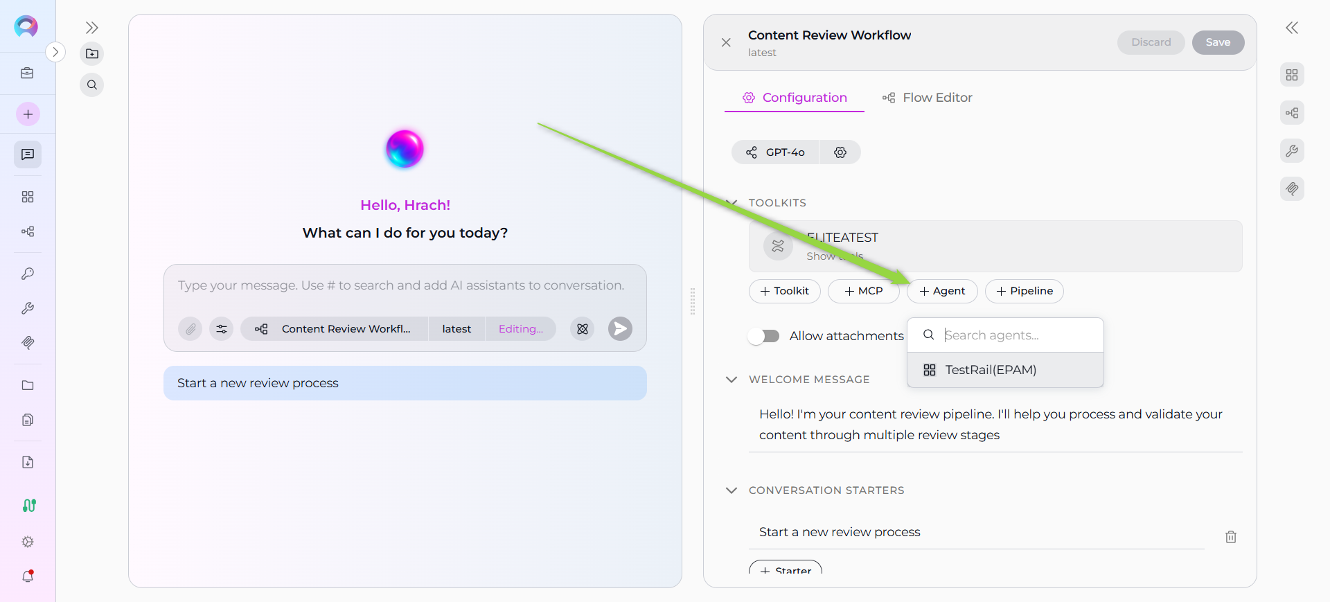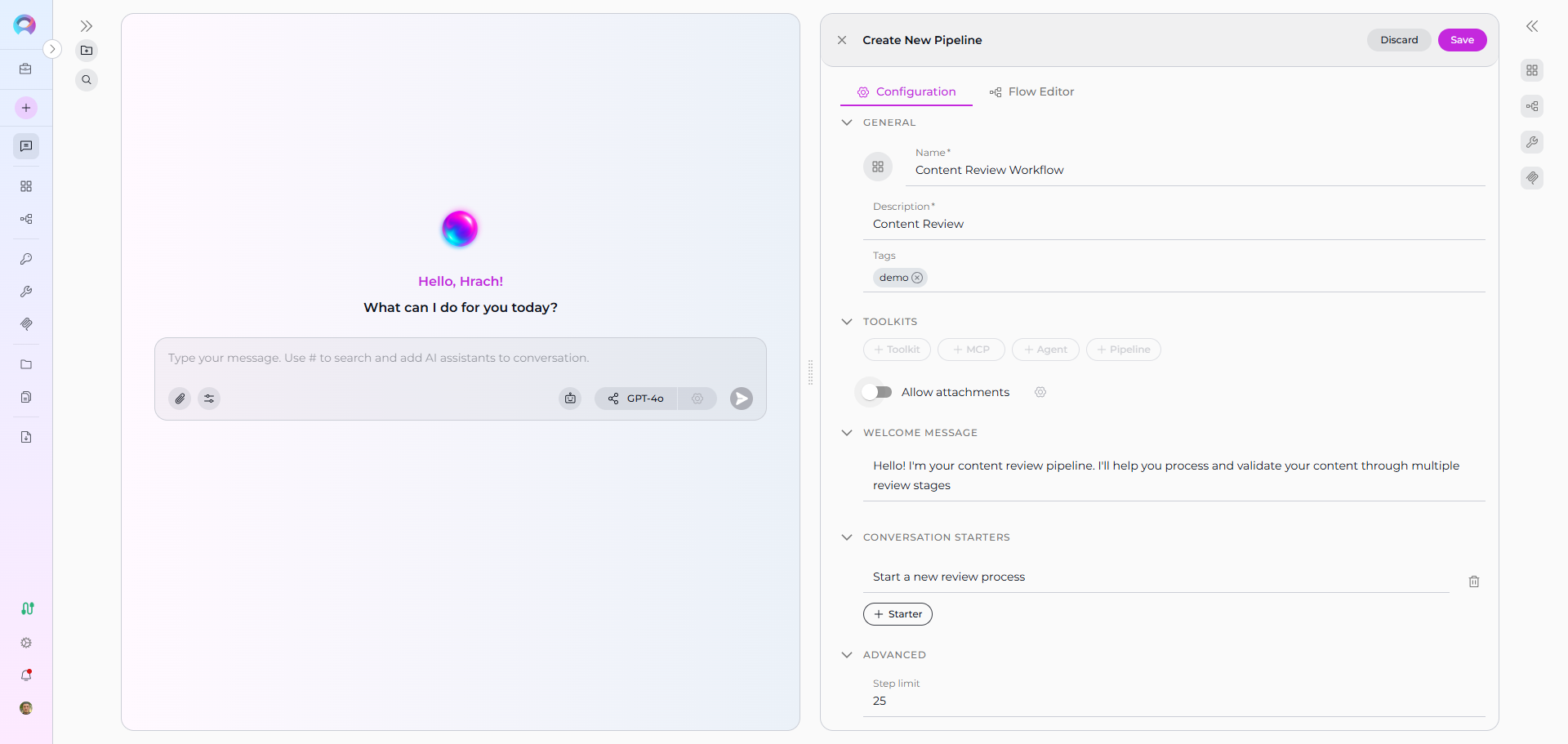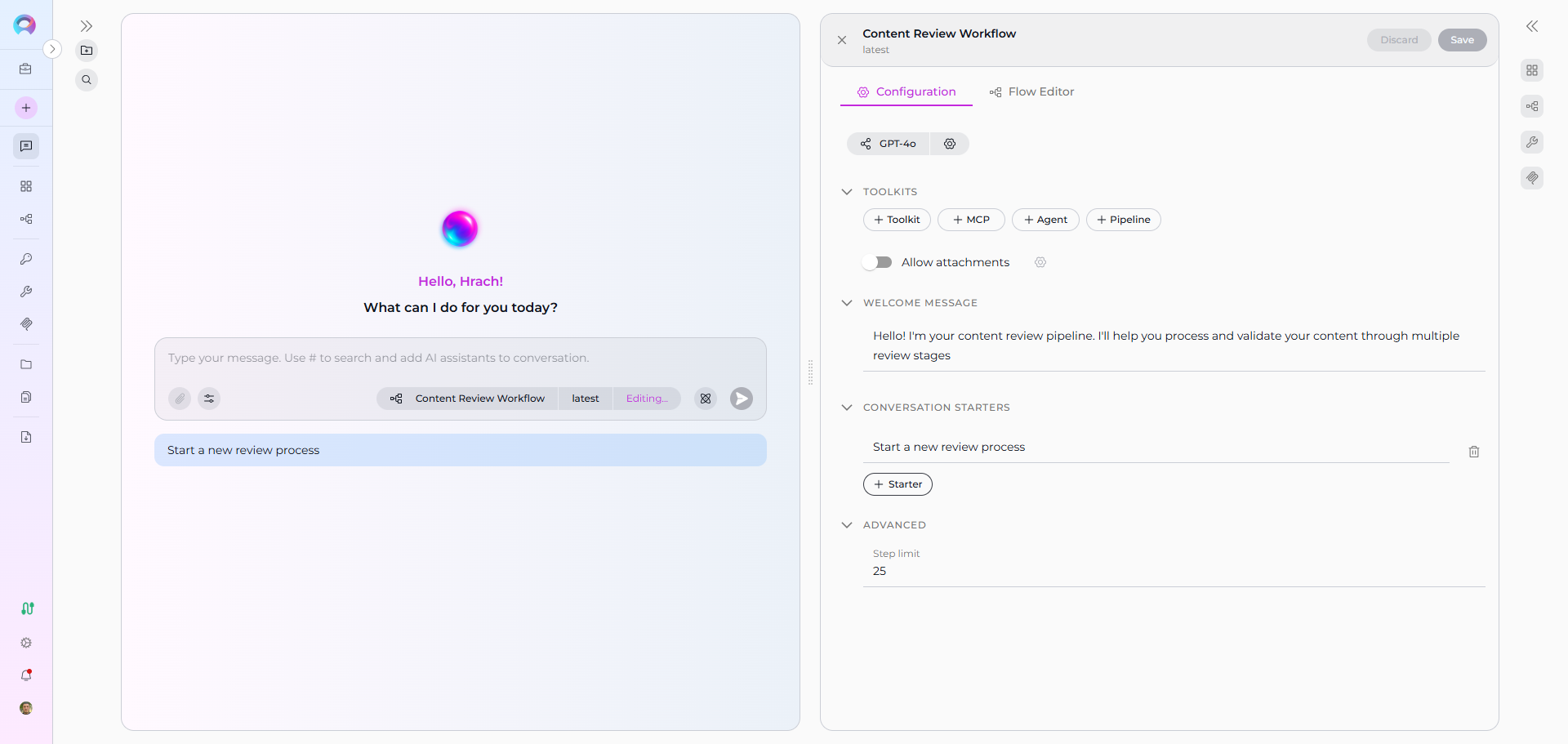 - Example: "Hello! I'm your content review pipeline. I'll help you process and validate your content through multiple review stages."