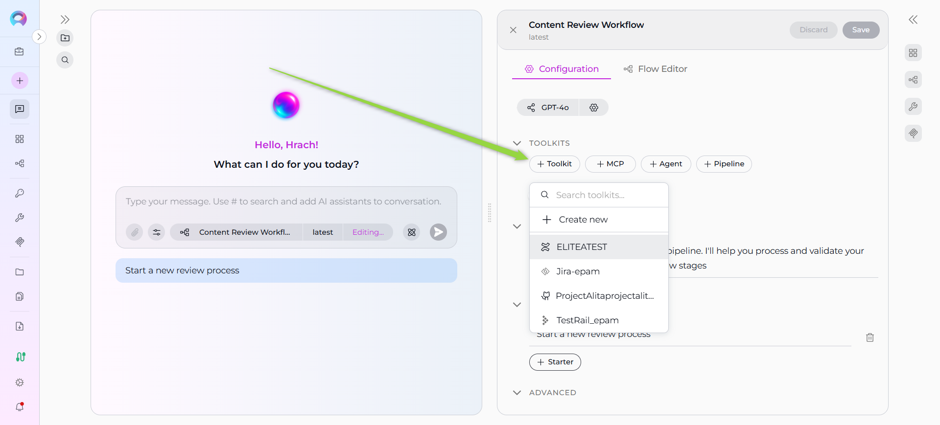 - Advanced Model Configuration: Integration with ELITEA's LLM model management system for comprehensive AI model selection and fine-tuning.