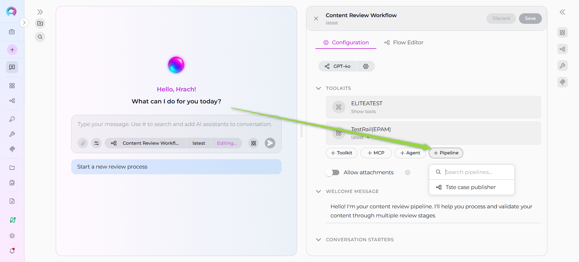 The Pipeline Canvas feature in ELITEA provides a powerful and intuitive way to manage AI pipeline creation and configuration directly from your chat interface. By following the practices outlined in this guide, you can effectively create, configure, and manage pipelines that enhance your development workflows and team collaboration.