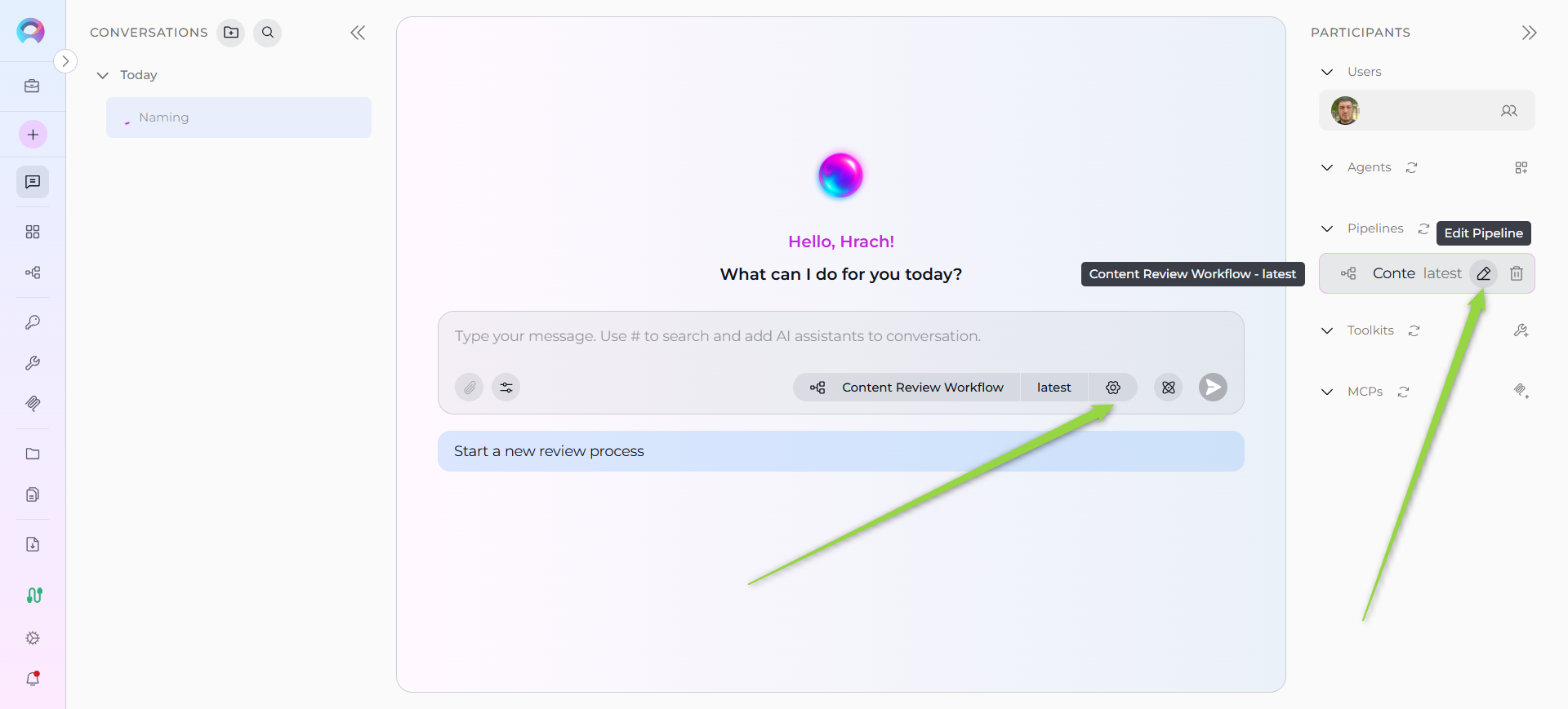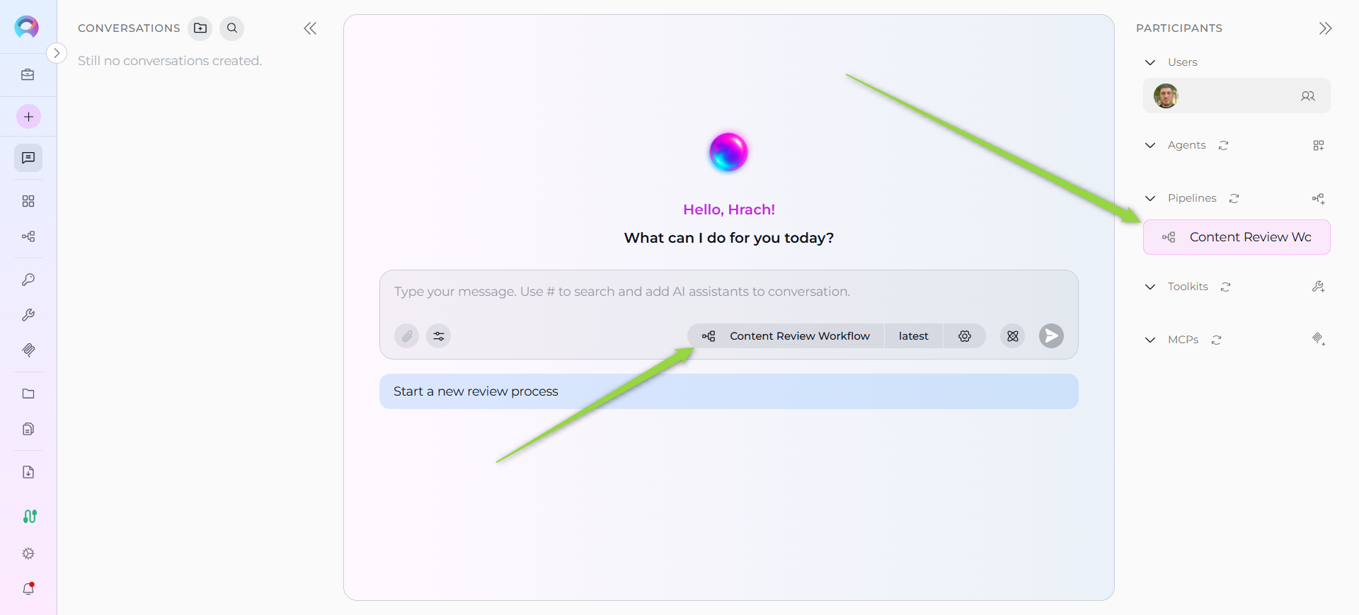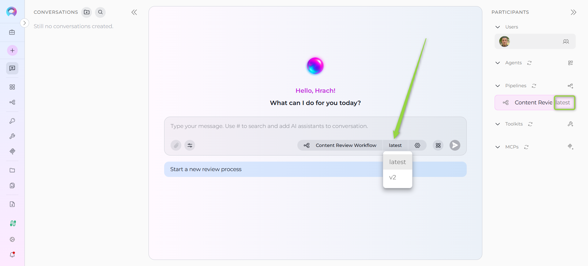 - Instant Integration: Created pipelines are immediately available for use in conversations and can be added to the PARTICIPANTS section.