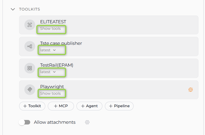 In the TOOLKITS section, you can enhance your pipeline's capabilities by adding various integrations: