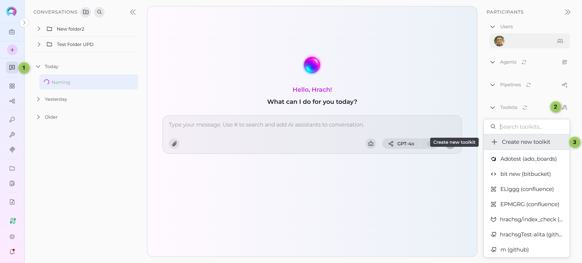 - Instant Integration: Created toolkits are immediately available for use in conversations and can be added to the PARTICIPANTS section.