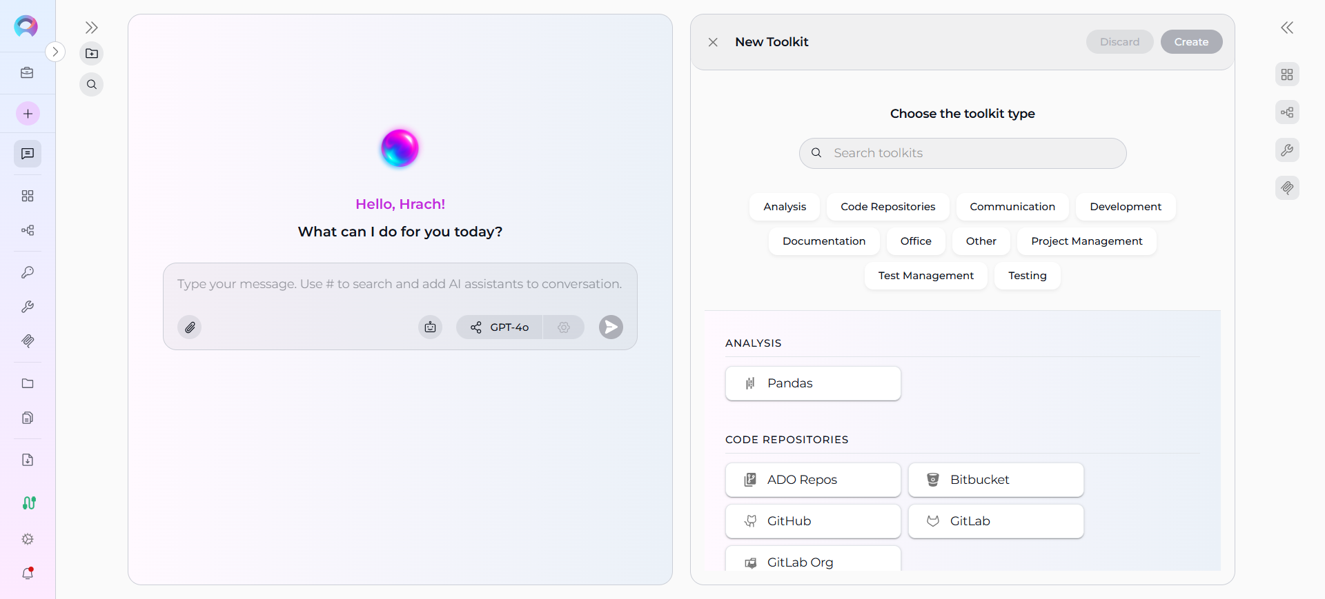 The Toolkit Canvas interface in ELITEA serves as an integrated toolkit management system accessible directly from the chat interface. This feature enables you to create, configure, and manage toolkits without leaving your conversation context, streamlining your development workflow.