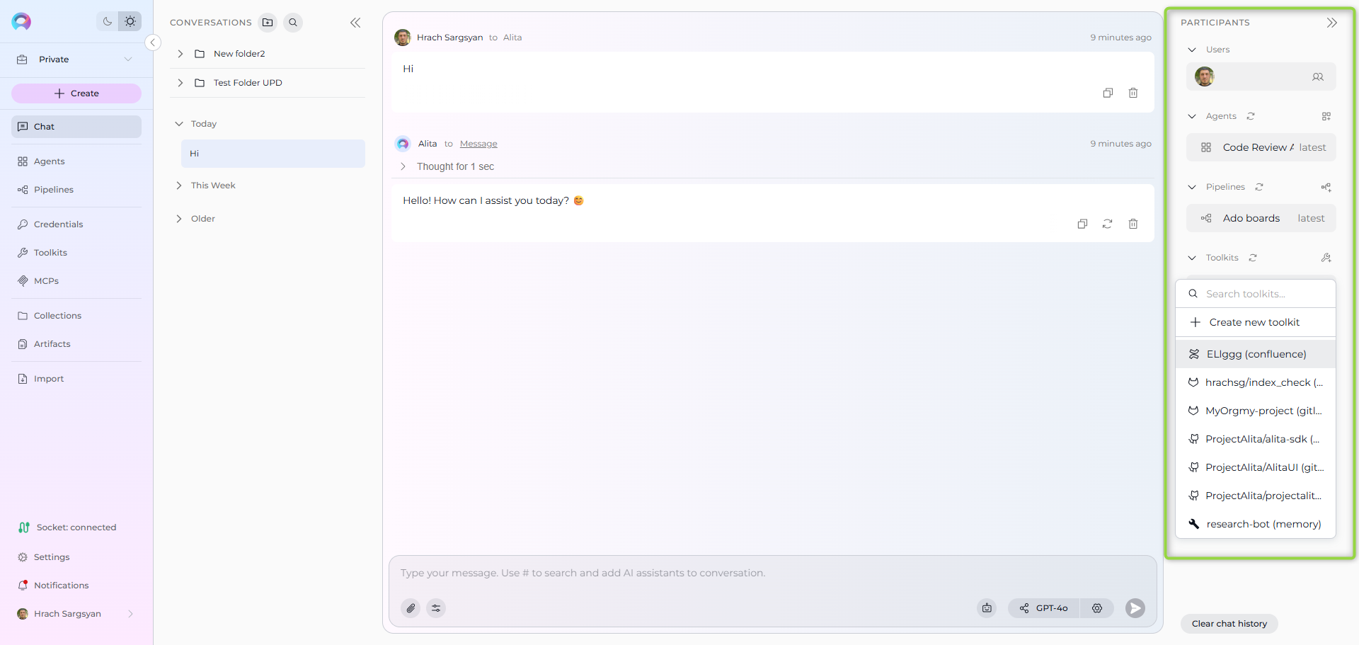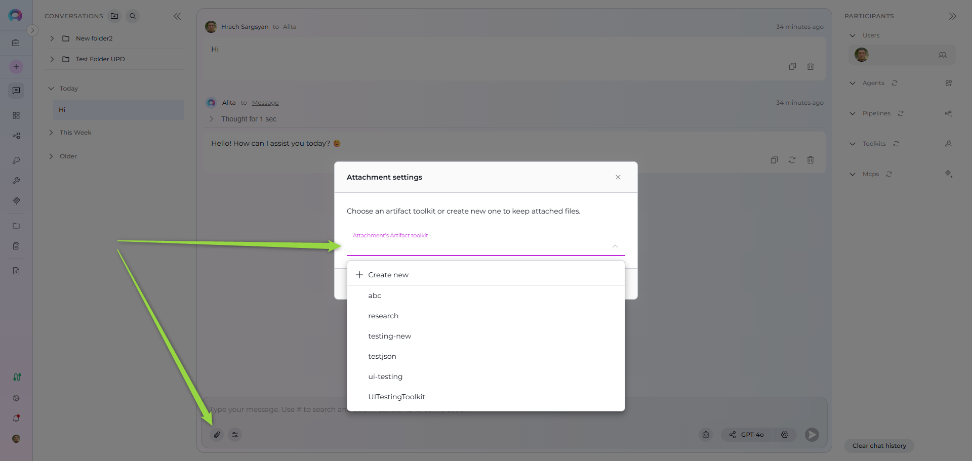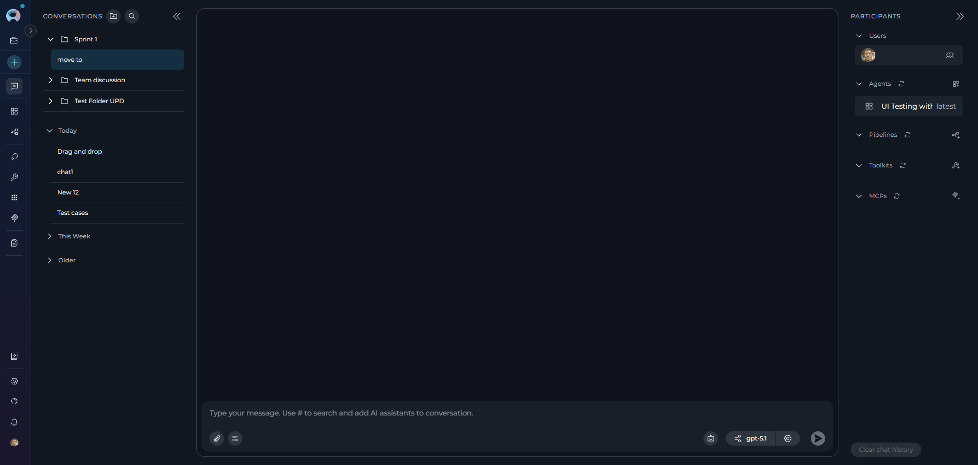 #to search and select an Agent, Pipeline, Toolkit, or MCP from the dropdown list that appears. Selected participants will appear as chips above the input box. - Select a model: Click the model selector dropdown to choose an LLM (e.g., GPT-4, Claude).