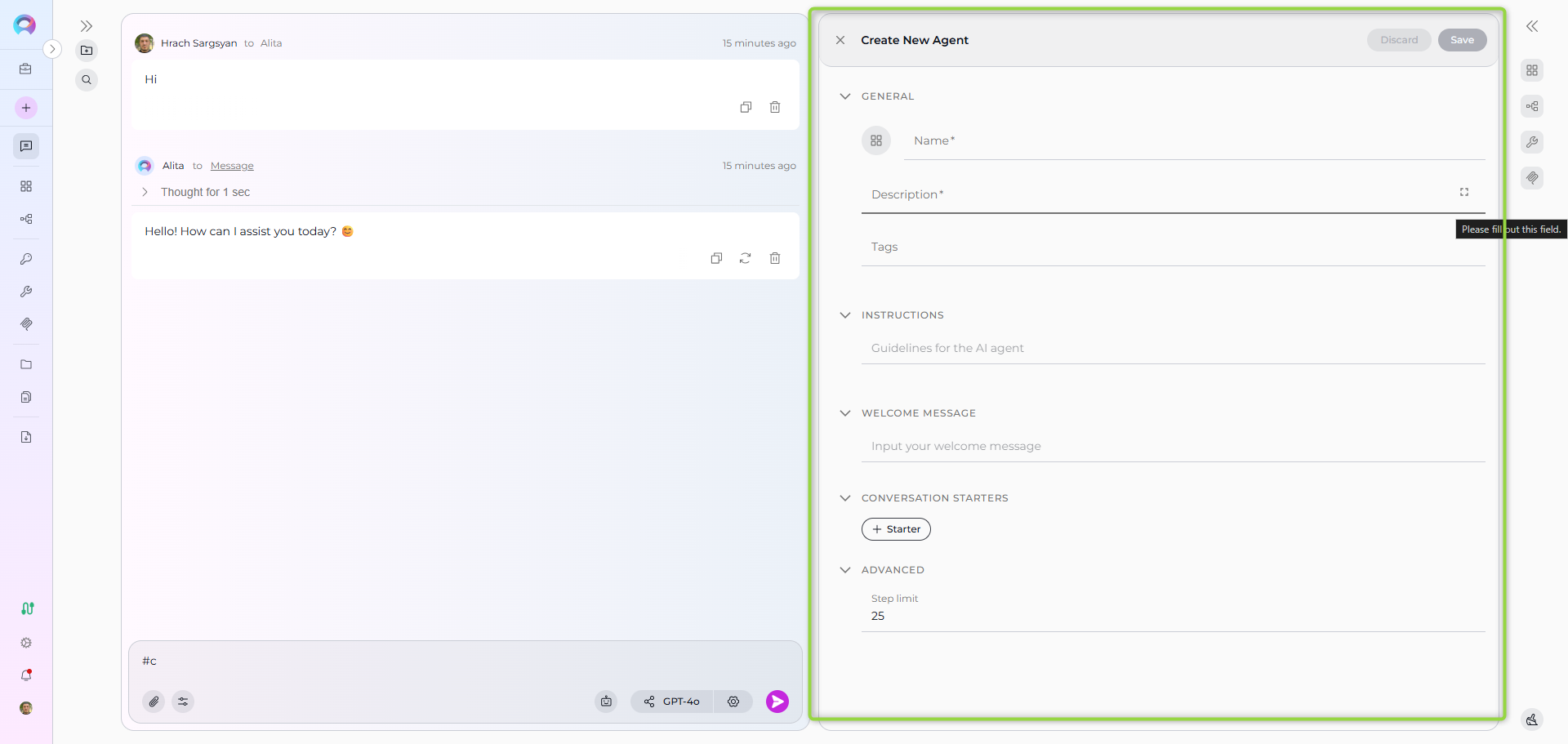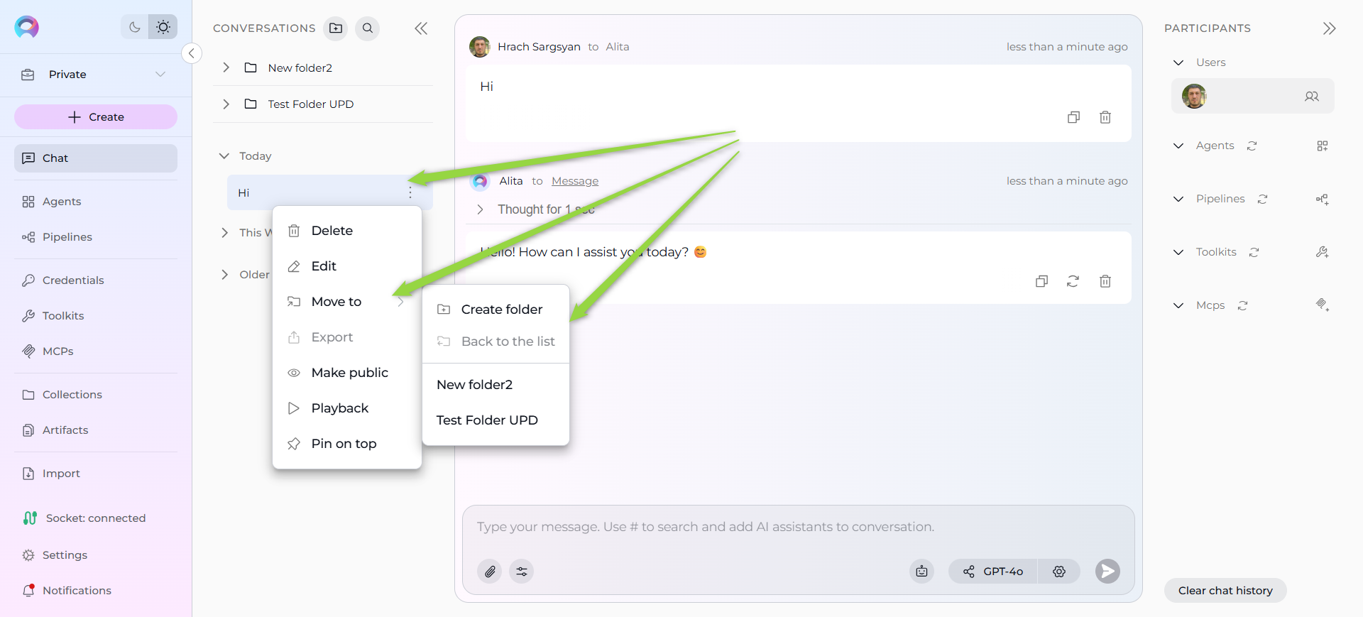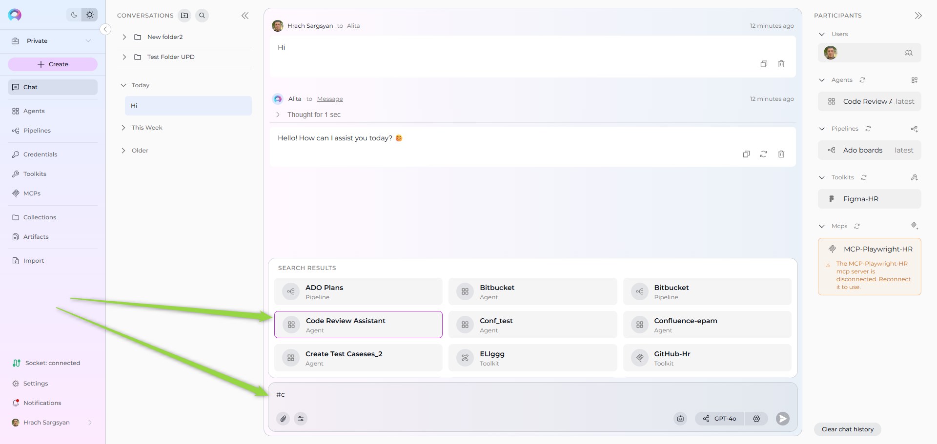 #to search and select an Agent, Pipeline, Toolkit, or MCP from the dropdown list that appears. Selected participants will appear as chips above the input box. - Select a model: Click the model selector dropdown to choose an LLM (e.g., GPT-4, Claude).