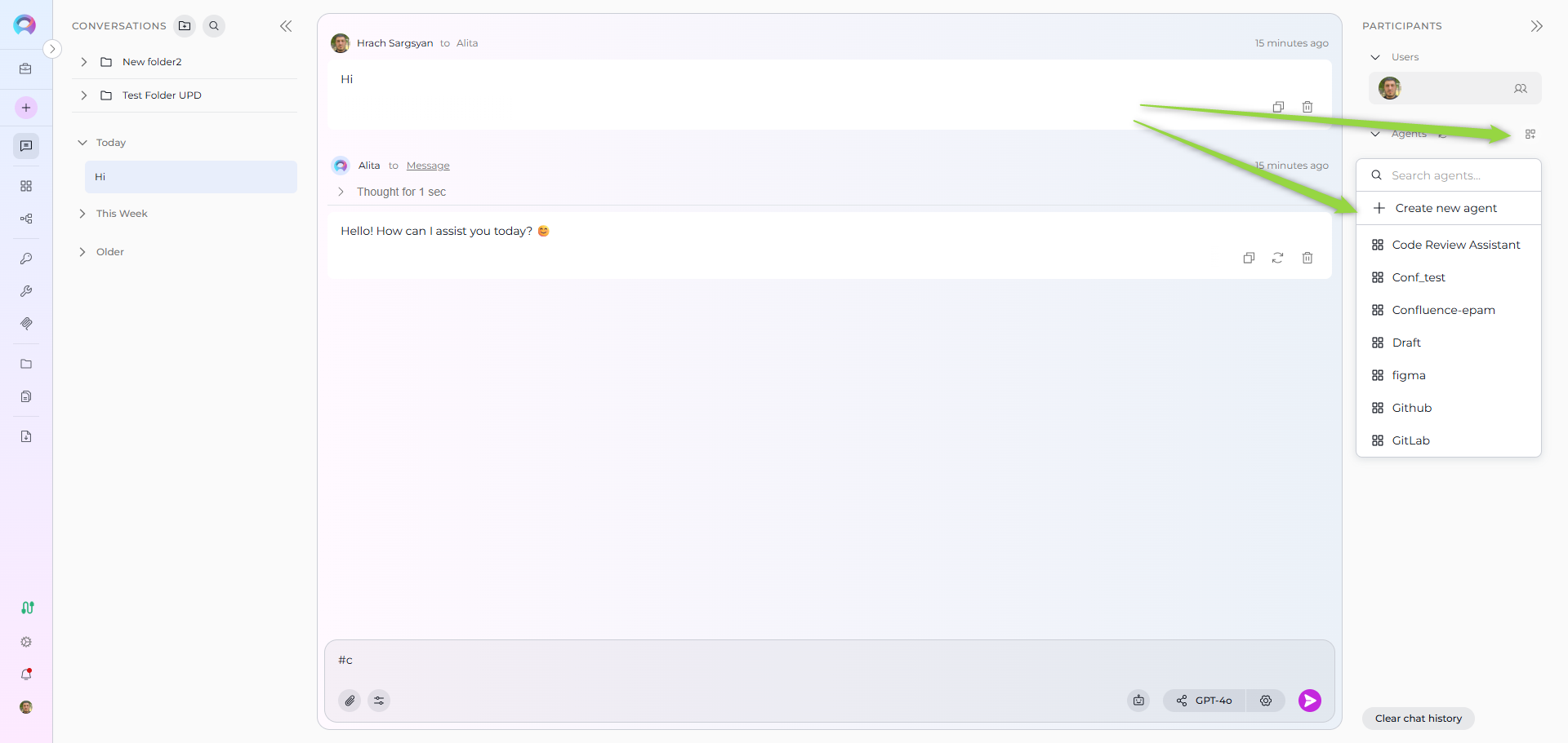 All your conversations are securely stored on the ELITEA server, making them accessible from any device where you log in. You can find all your conversations listed under the Chat menu in the sidebar.
