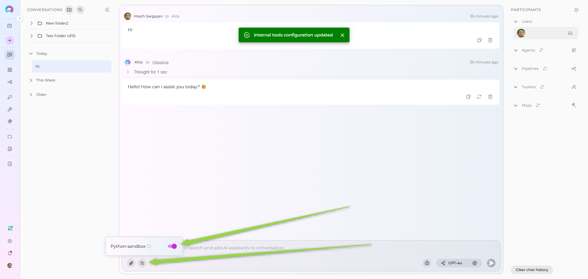 Internal tools provide built-in capabilities that enhance your conversations and agents without requiring external integrations. Currently, ELITEA supports the Python Sandbox internal tool.