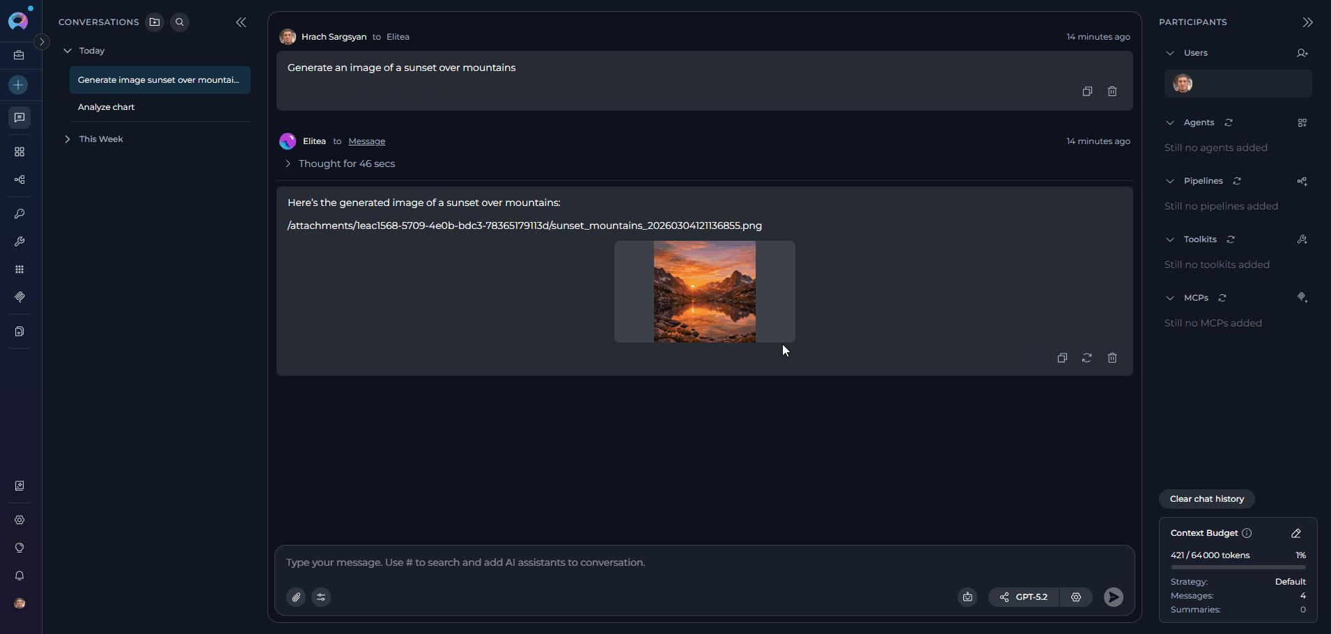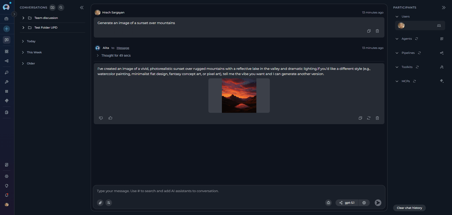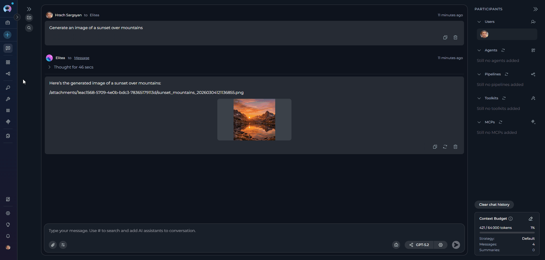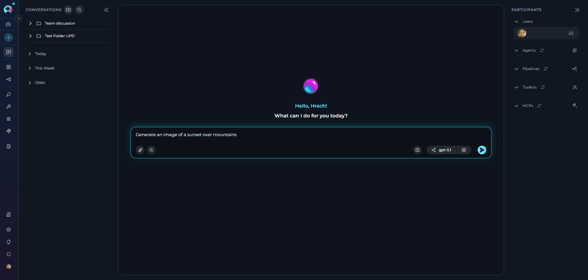 The Image Generation feature enables AI-powered creation of images directly from text prompts within Chat conversations and Agents. When using an LLM model with image generation capabilities (such as GPT-5.1, DALL-E 3, or other vision-enabled models) and the Image Generator internal tool is enabled, you can generate high-quality images through natural language descriptions.