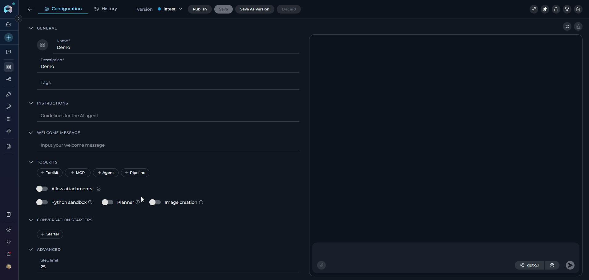 - Conversation: An active conversation or agent configuration