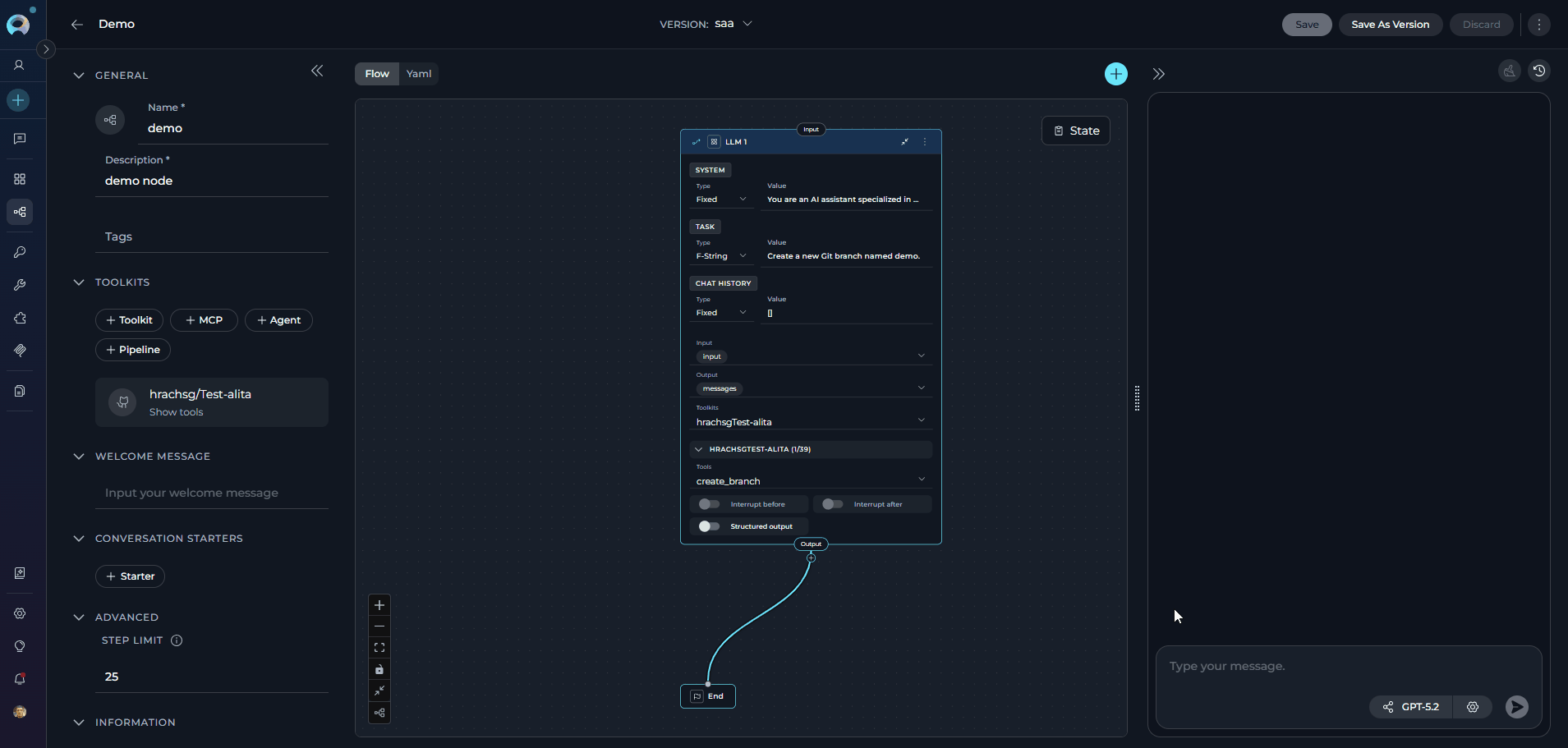 A DevOps agent has access to the GitHub toolkit and can manage repositories. Deleting repositories, branches, or merging pull requests are all protected — any attempt by the agent triggers the authorization dialog.