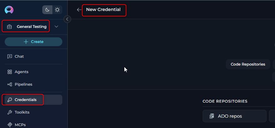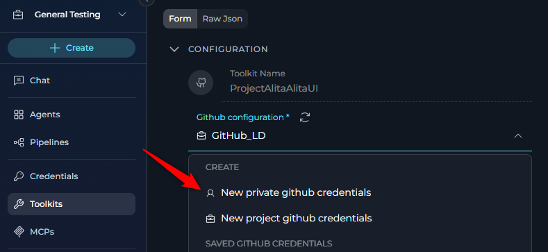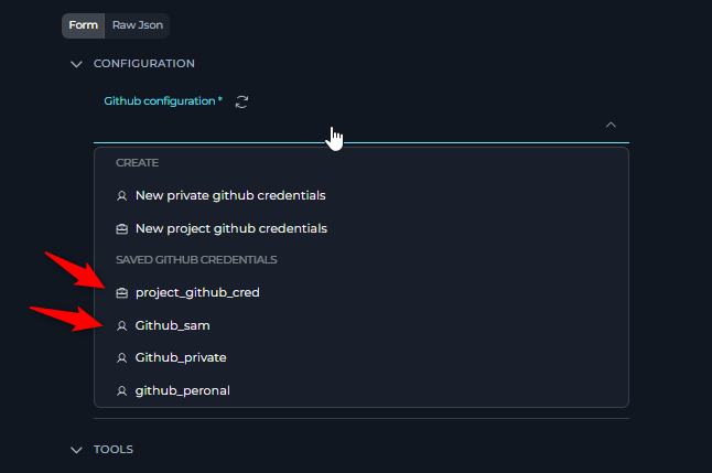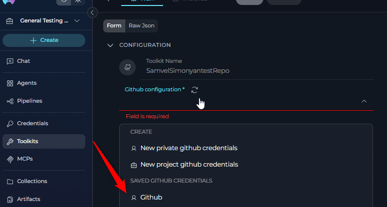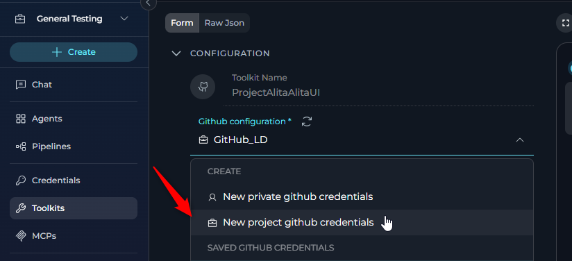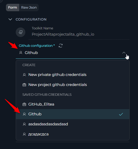 - Filtered by toolkit type (e.g., only GitHub credentials for GitHub toolkit)