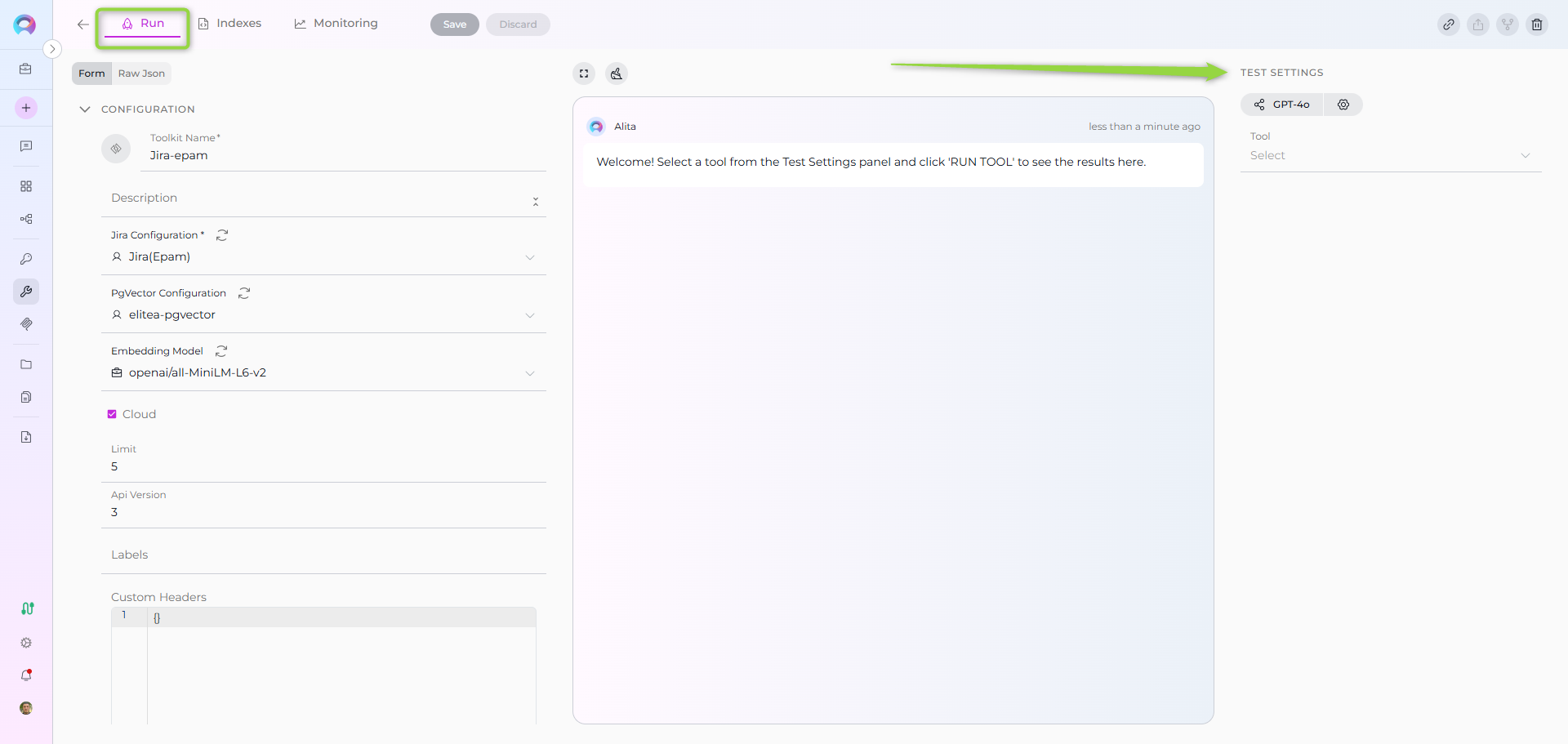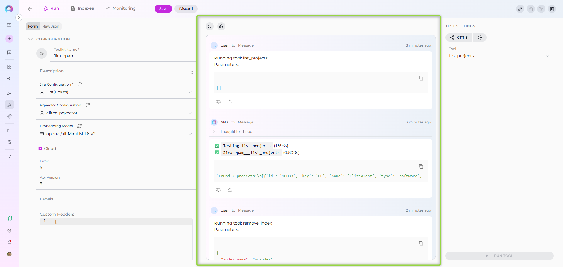 { "fields": { "project": { "key": "EL" }, "summary": "Test issue from ELITEA toolkit", "issuetype": { "name": "Task" }, "description": { "type": "doc", "version": 1, "content": [ { "type": "paragraph", "content": [ { "type": "text", "text": "This is a test issue created via toolkit testing" } ] } ] } } } ``` - Run Tool: Click RUN TOOL