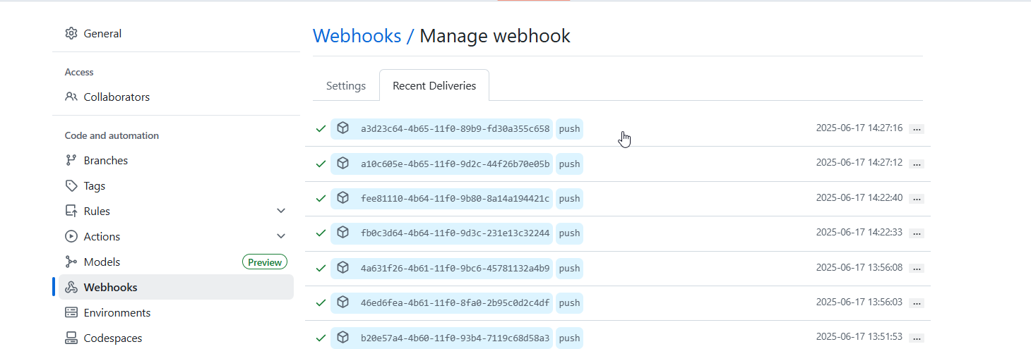 Q: Where can I monitor if my webhooks are being delivered successfully and if Elitea is processing them? A: * GitHub: In your repository's Settings > Webhooks page, select your configured webhook. The "Recent Deliveries" tab provides a log of attempts, showing HTTP status codes, request/response headers, and payloads for successful and failed deliveries. * GitLab: In your project's Settings > Webhooks page, select your configured webhook. You can view recent events and their delivery status. Clicking on an event often shows details of the request and response.