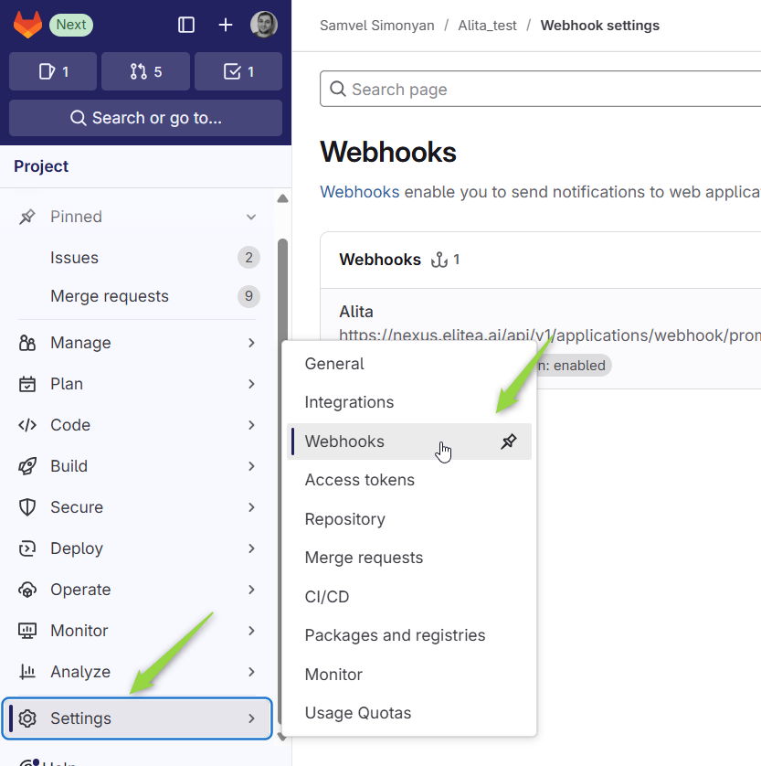 Navigate to Repository Settings: Go to your GitLab project, then navigate to Settings > Webhooks.