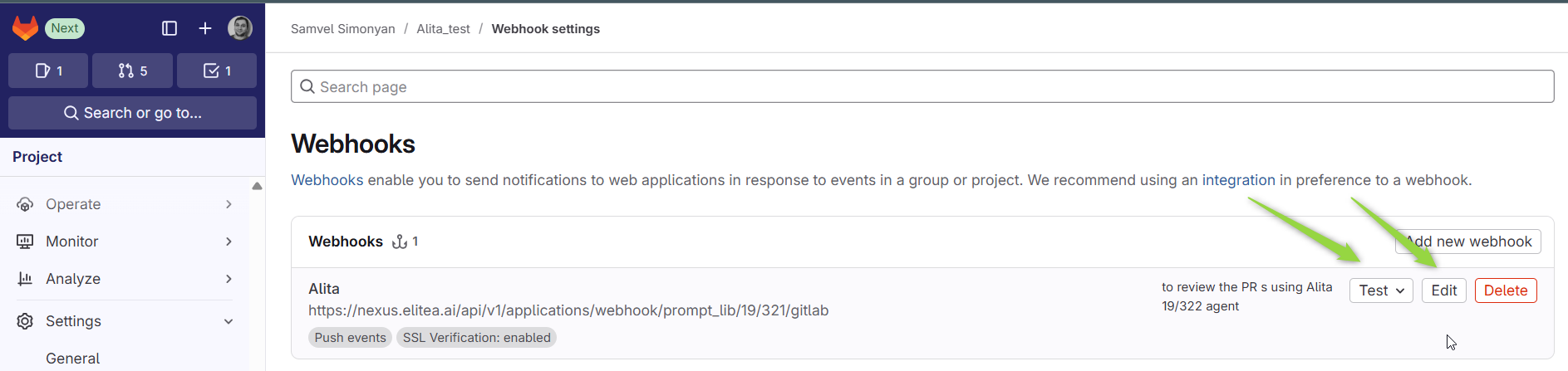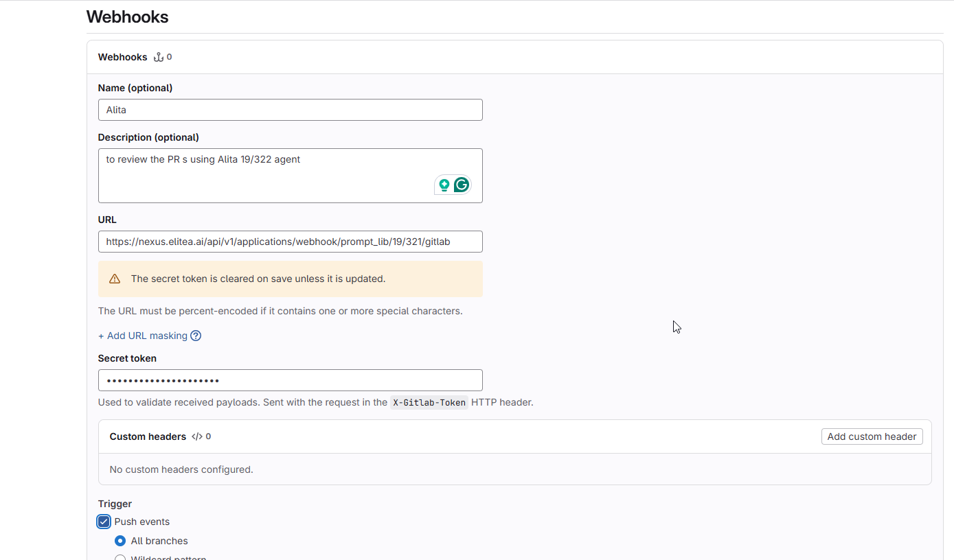 /gitlabat the end:{{alita_deployment_url}}/api/v1/applications/webhook/prompt_lib/{{project_id}}/{{agent_version_id}}/gitlab- Replace placeholders as described for GitHub.