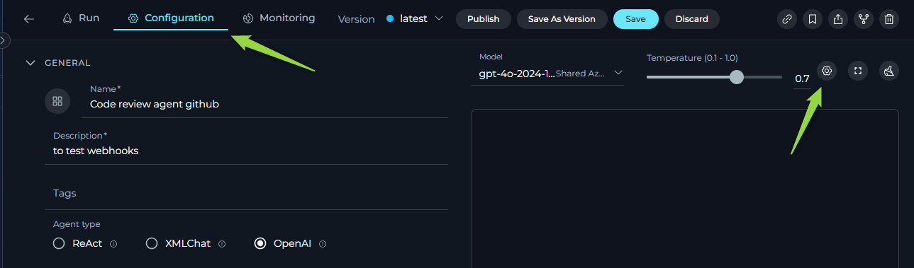 - Navigate to your Elitea Agent: Open the configuration page for the agent you want to use with webhooks.