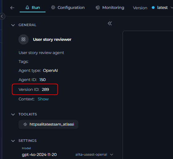 {{issue.key}}(JIRA Smart Value): A placeholder used in JIRA Automation that JIRA replaces with the actual key of the issue being processed (e.g., "PROJECT-123").ProjectID(Elitea): A unique identifier for your project within the Elitea platform.ApplicationVersionID(Elitea): A unique identifier for a specific version of your configured Elitea agent.- JIRA Toolkit (Elitea): A set of tools within an Elitea agent that allows it to interact with JIRA (More about Jira toolkit here)