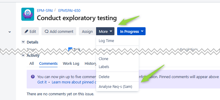 - Look for the button you named (e.g., "Eliea Review Story"). It might be under the "Actions" menu (...) or directly visible on the issue view, depending on your JIRA version and configuration.