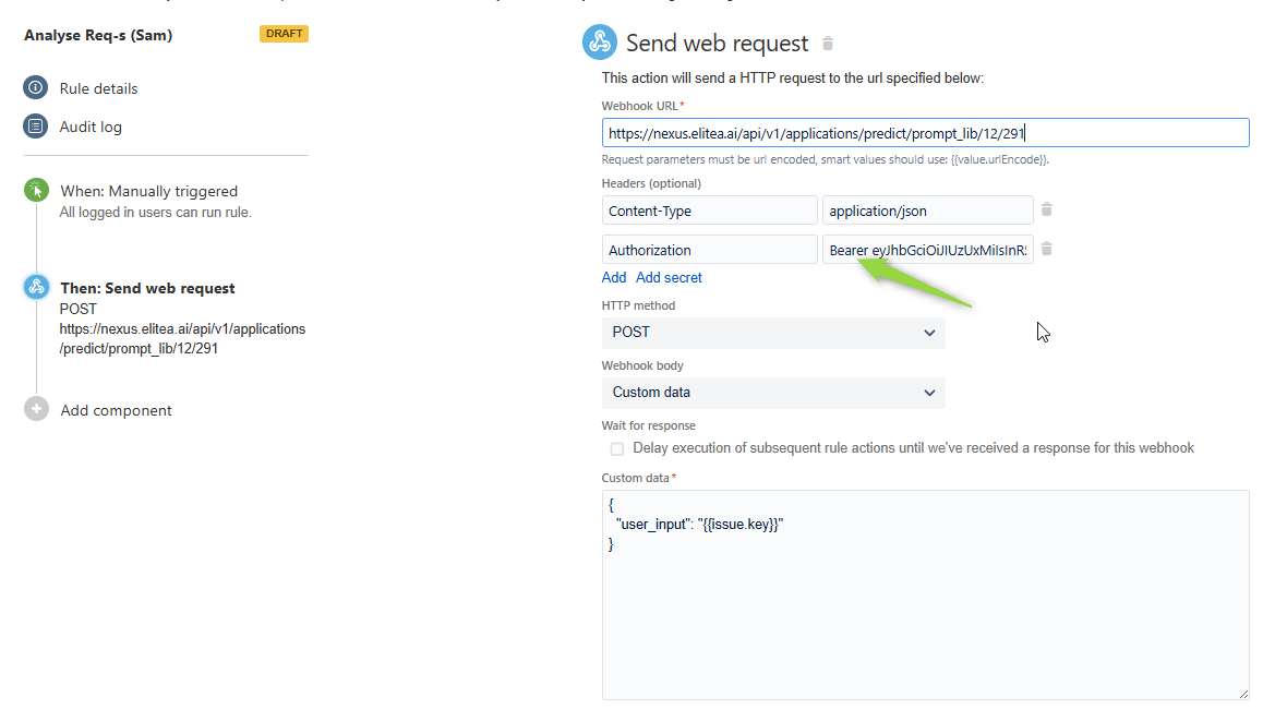 ELITEA_API_TOKEN) in JIRA's automation settings and reference it here likeBearer {{secrets.ELITEA_API_TOKEN}}. This keeps your token secure.
