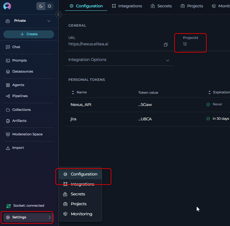 ProjectIDandApplicationVersionID:- ProjectID: Find this in your Elitea "Settings" -> "Configuration" page.