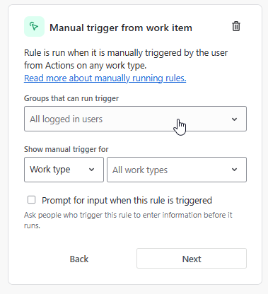 - Rule Permissions/Scope: Ensure the rule is configured to be visible/usable by the intended project members or roles if it's a manual trigger.