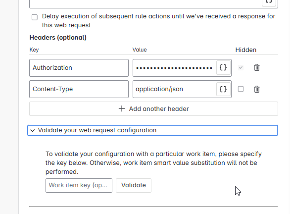 - In the JIRA "Send web request" action configuration, there's often a button to validate the setup. Use this with a real issue key and review the request details.