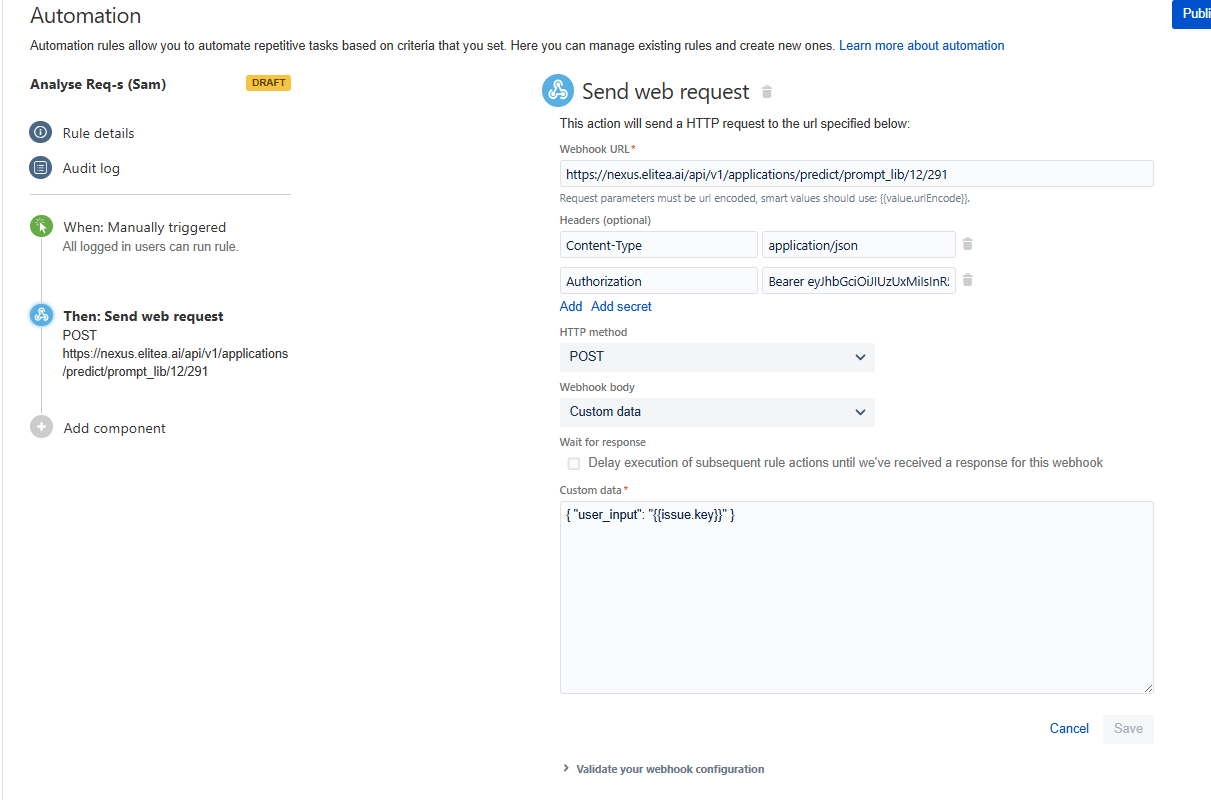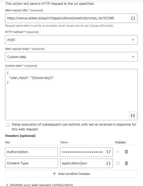 Custom data. - Validate your web request configuration: Use this JIRA feature to test the connection to the Elitea API with a sample issue key before saving the rule.