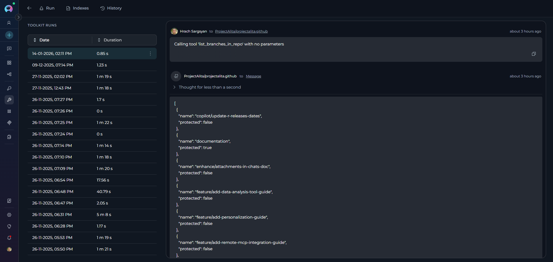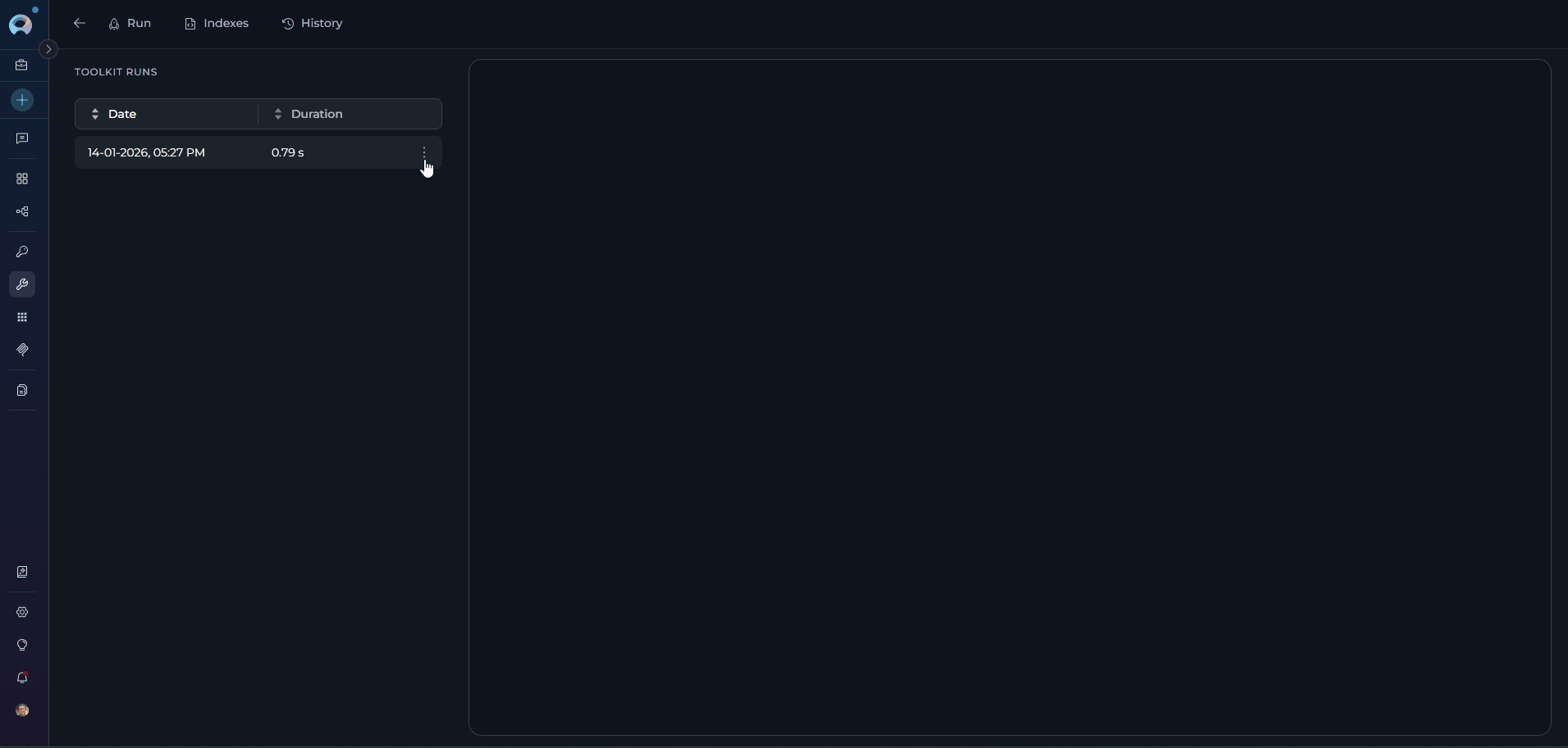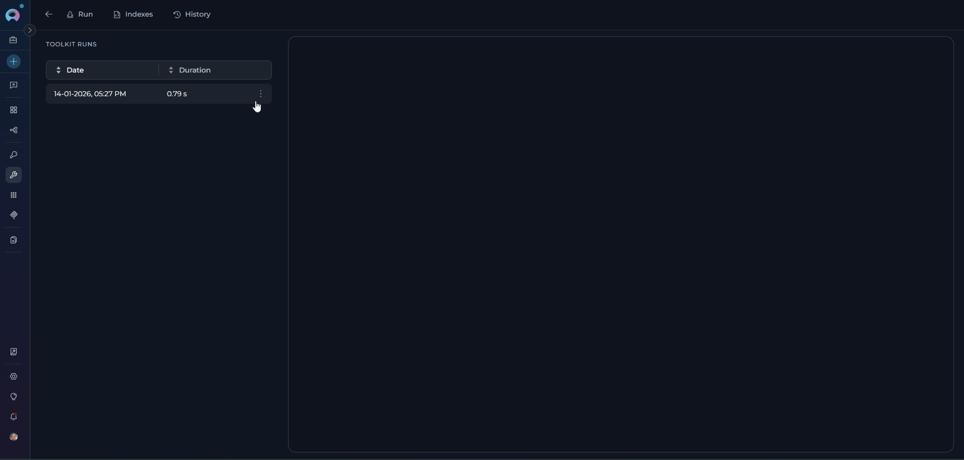 The History Tab is a feature within the Toolkit detail page that provides a comprehensive record of all toolkit execution runs. It enables users to track, review, and audit toolkit operations by displaying detailed information about each run, including execution parameters, timestamps, duration, and results.