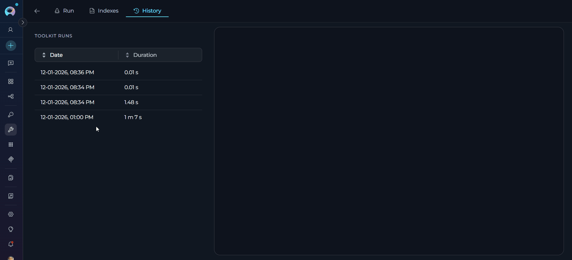 - Select from List: Click any row in the left panel run history table