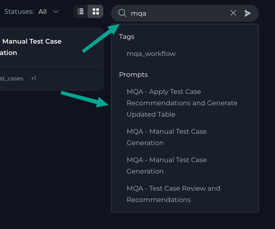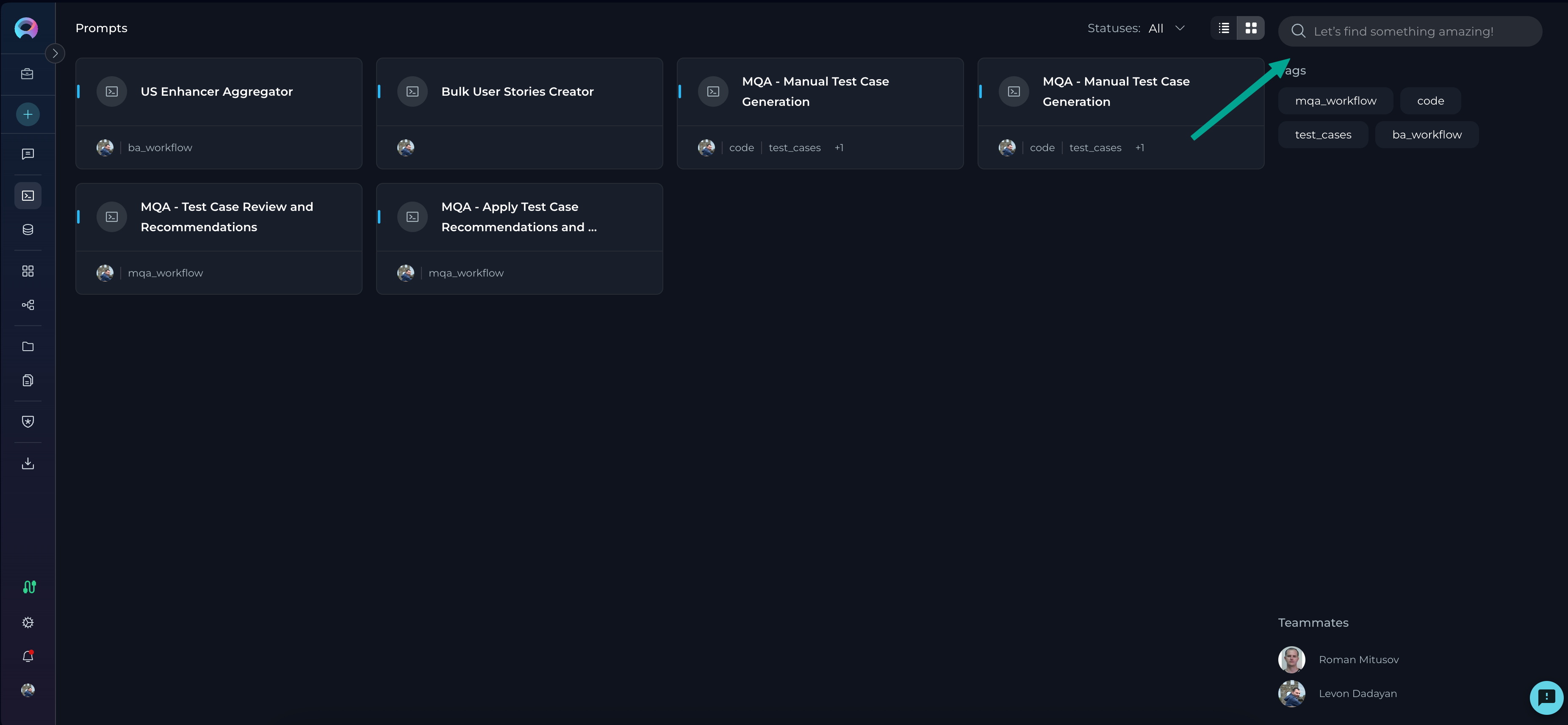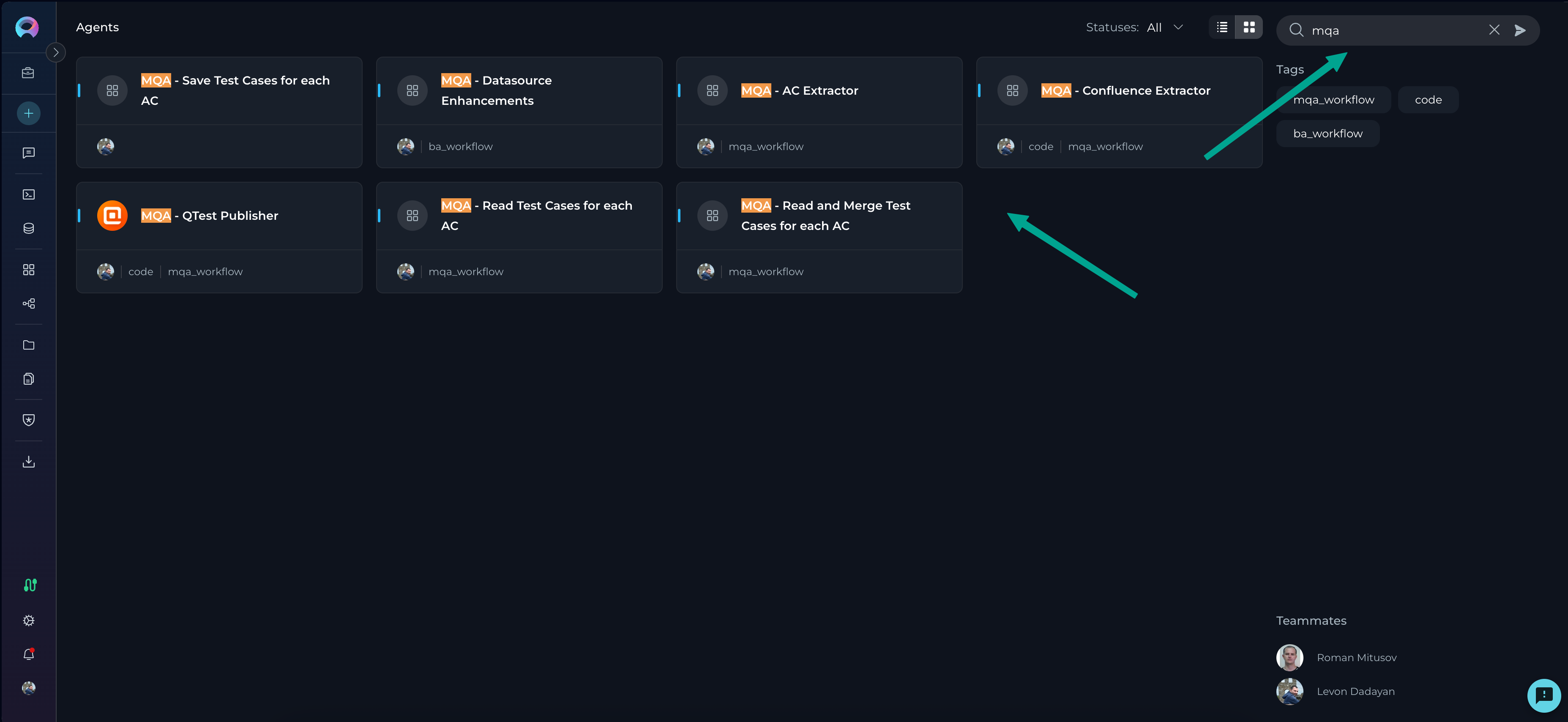 ELITEA's search helps you quickly find entities by searching their names and descriptions. You can also filter results by selecting tags.