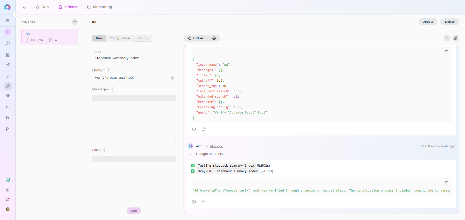 This guide provides a complete step-by-step walkthrough for indexing Xray Cloud data and then searching or chatting with the indexed content using ELITEA's AI-powered tools.
