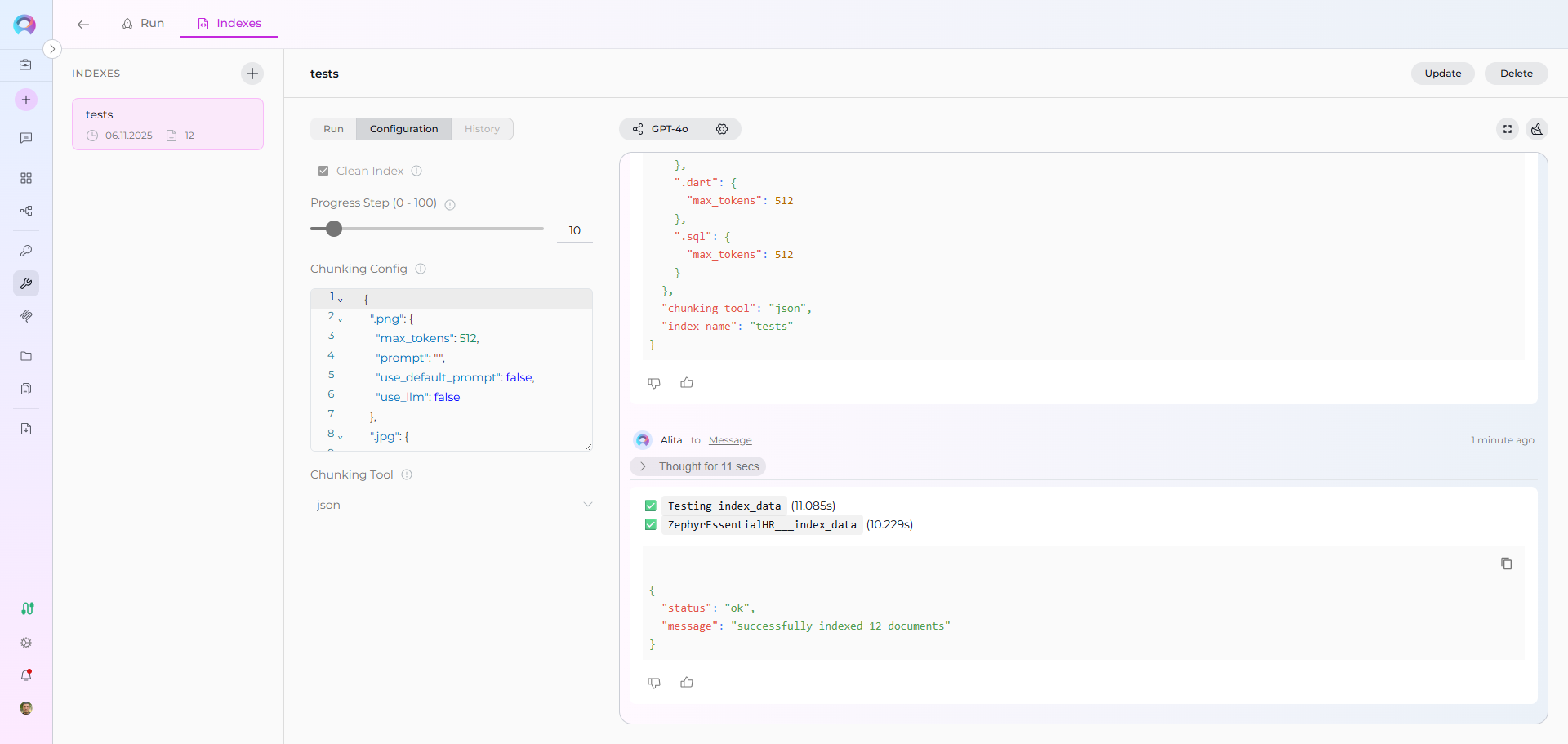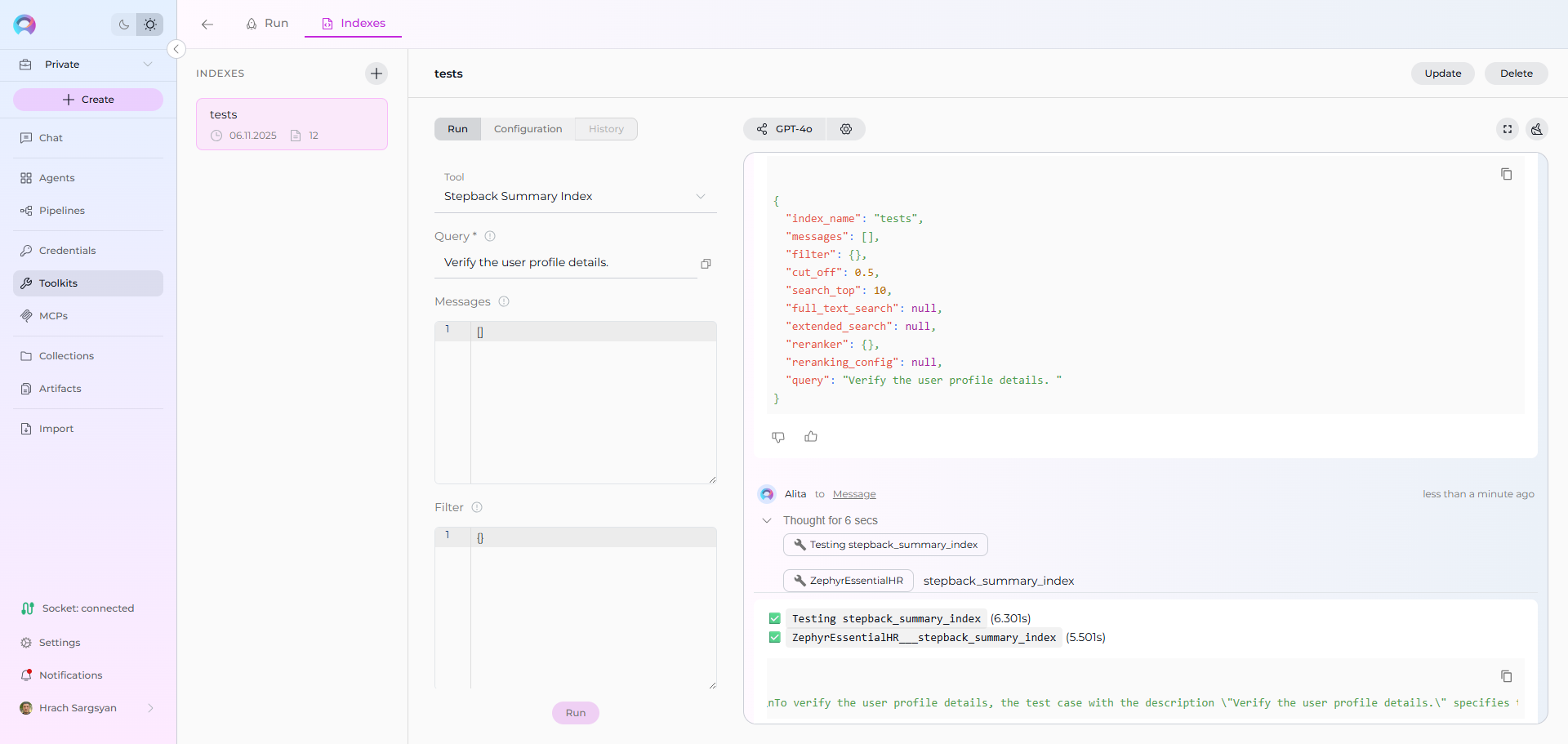 This guide provides a complete step-by-step walkthrough for indexing Zephyr test management data and then searching or chatting with the indexed content using ELITEA's AI-powered tools.