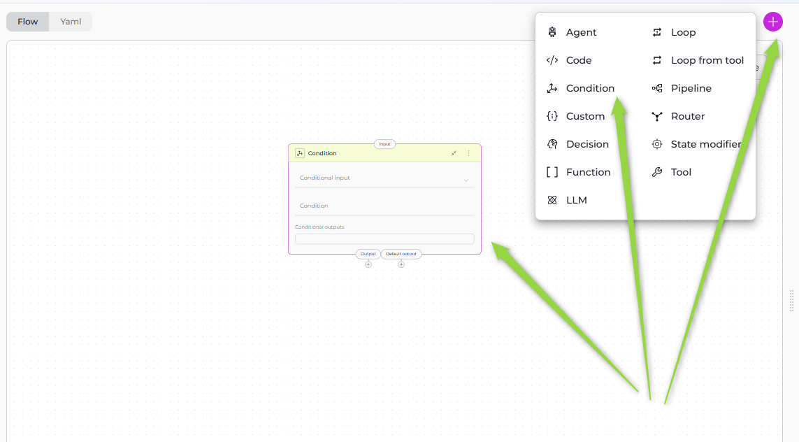 | Conditional Outputs | Define the named output paths that the condition can route to | Configuration: List of node IDs or route names that correspond to the outputs returned by the condition Example: - Article Publisher- Article ReviewerHow It Works: Condition returns a route name, which must be listed in Conditional Outputs |