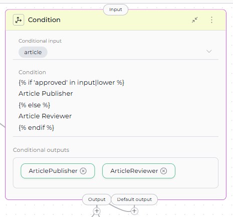 | Condition | Define the conditional logic that determines which output path to take | Syntax: Template syntax (Jinja2-like) similar to Router Node Example: {% if 'approved' in input|lower %} Article Publisher {% else %} Article Reviewer {% endif %} Template Features: String matching, comparisons, multiple conditions with {% elif %} |