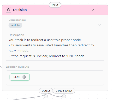 | Default Output | Specify the fallback route if the LLM cannot make a confident decision | Options: Select a node ID from available nodes in the pipeline Example: ENDFallback Behavior: If LLM can't decide confidently, execution goes to Default Output |