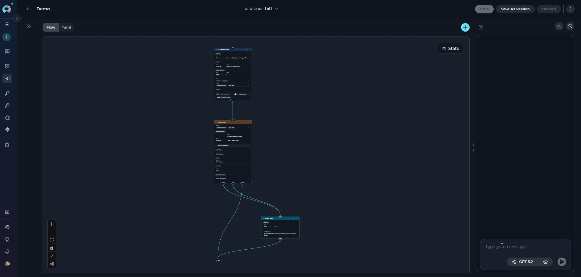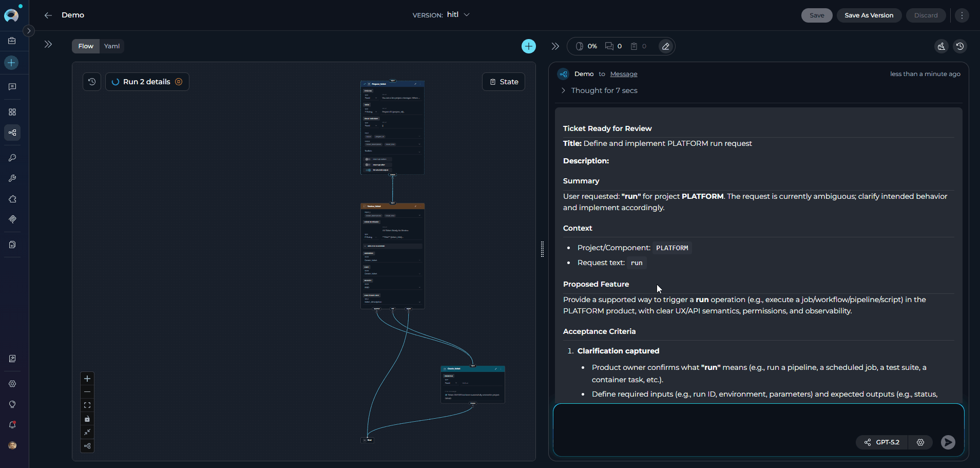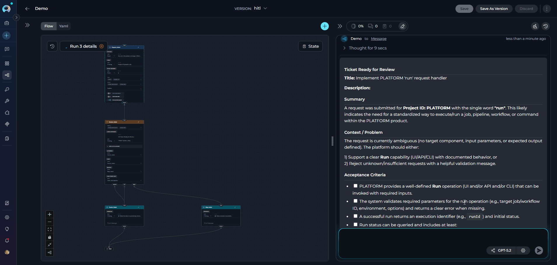 | Decision Logic | Template-based conditions (Jinja2-like) | LLM reasoning from natural language description | Human judgment (Approve / Edit / Reject buttons) |
