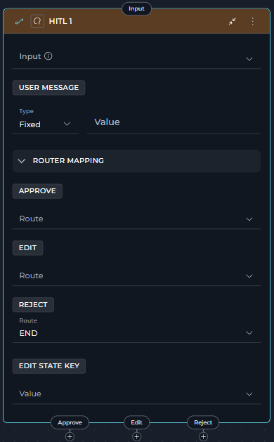 | Configuration | Condition, Routes, Input, Default Output | Input, Description, Nodes (decision outputs), Default Output | User Message, Routes (approve/reject/edit), Edit State Key |