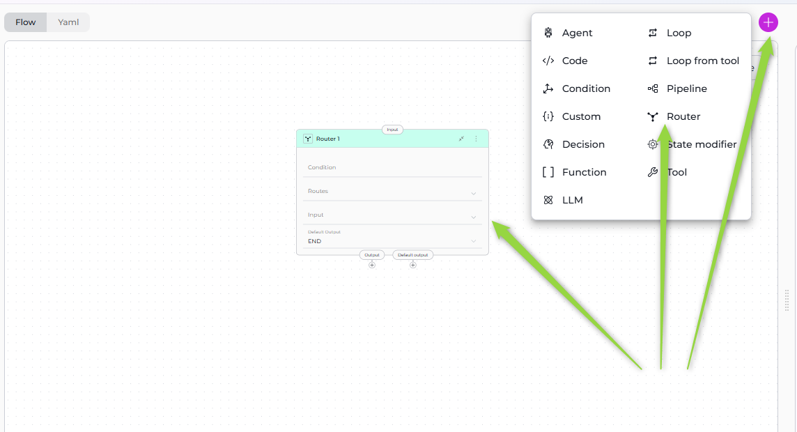 | Routes | Define the named paths (node IDs) that the router can select | Configuration: List of node IDs that correspond to the route names returned by the condition Example: - ArticlePublisher- ENDImportant: Route names in the condition must exactly match node IDs in the Routes list |